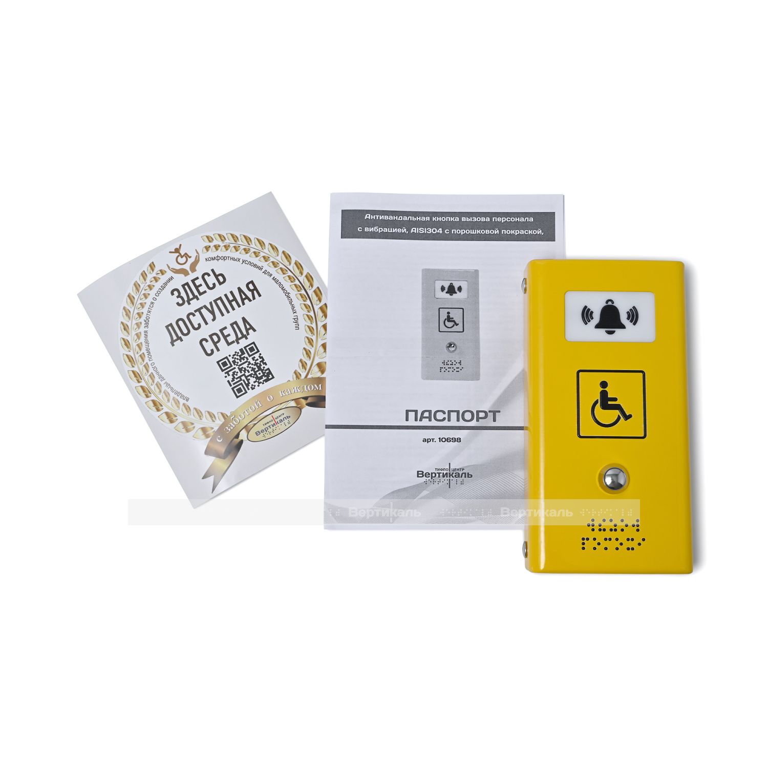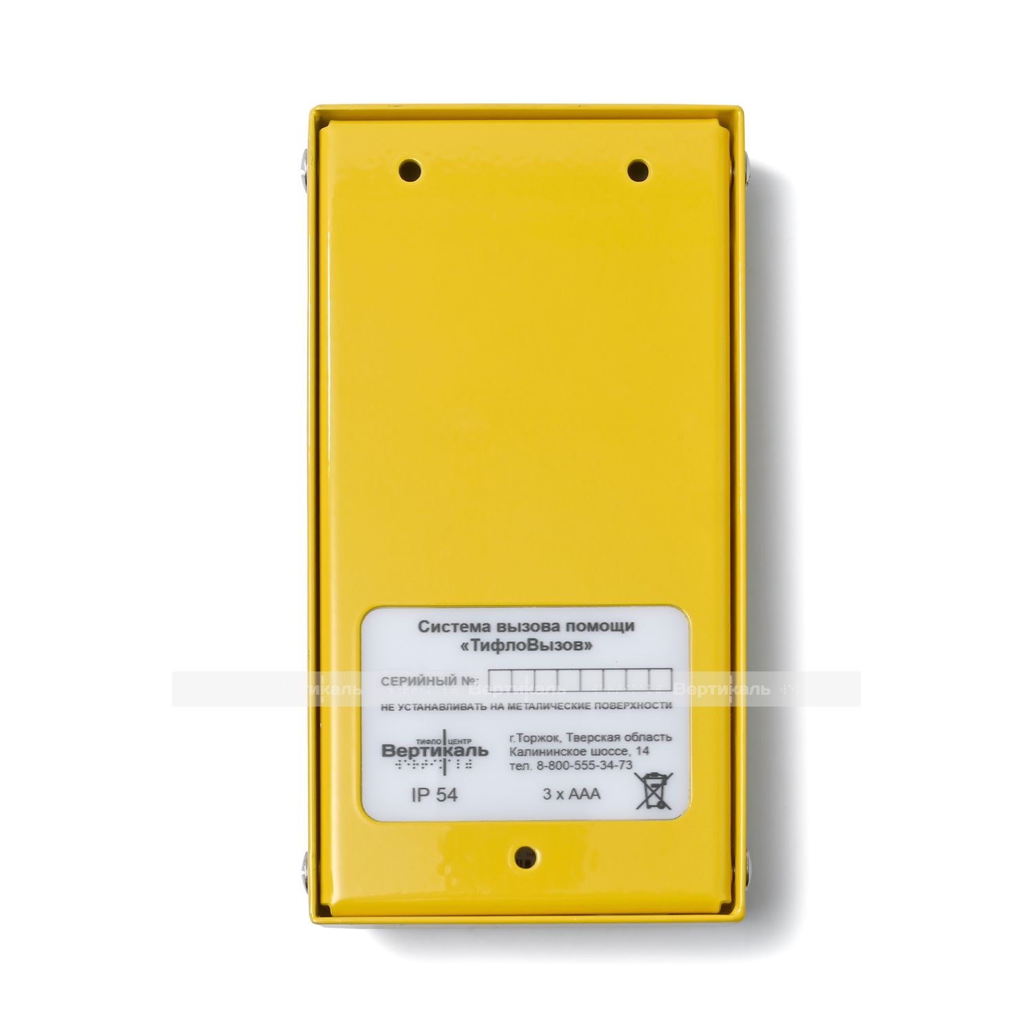 Изделие представляет собой электронное, устройство выполнение в антивандальном исполнении из нержавеющей стали с последующим окрашиванием порошково-полимерным способом, для обеспечения антикоррозионных условий. На поверхность корпуса, выполненную посредством тифлографики и шрифта по системе Брайля, нанесена тактильная информация о назначении изделия (вызов помощи). Устройство предназначено для передачи радиосигнала на частоте 433 МГц и активации беспроводных приемников сигналов ПС-1099, ПС-1999 и ПС-999, обеспечивающих воспроизведение голосовых сообщений на русском языке.