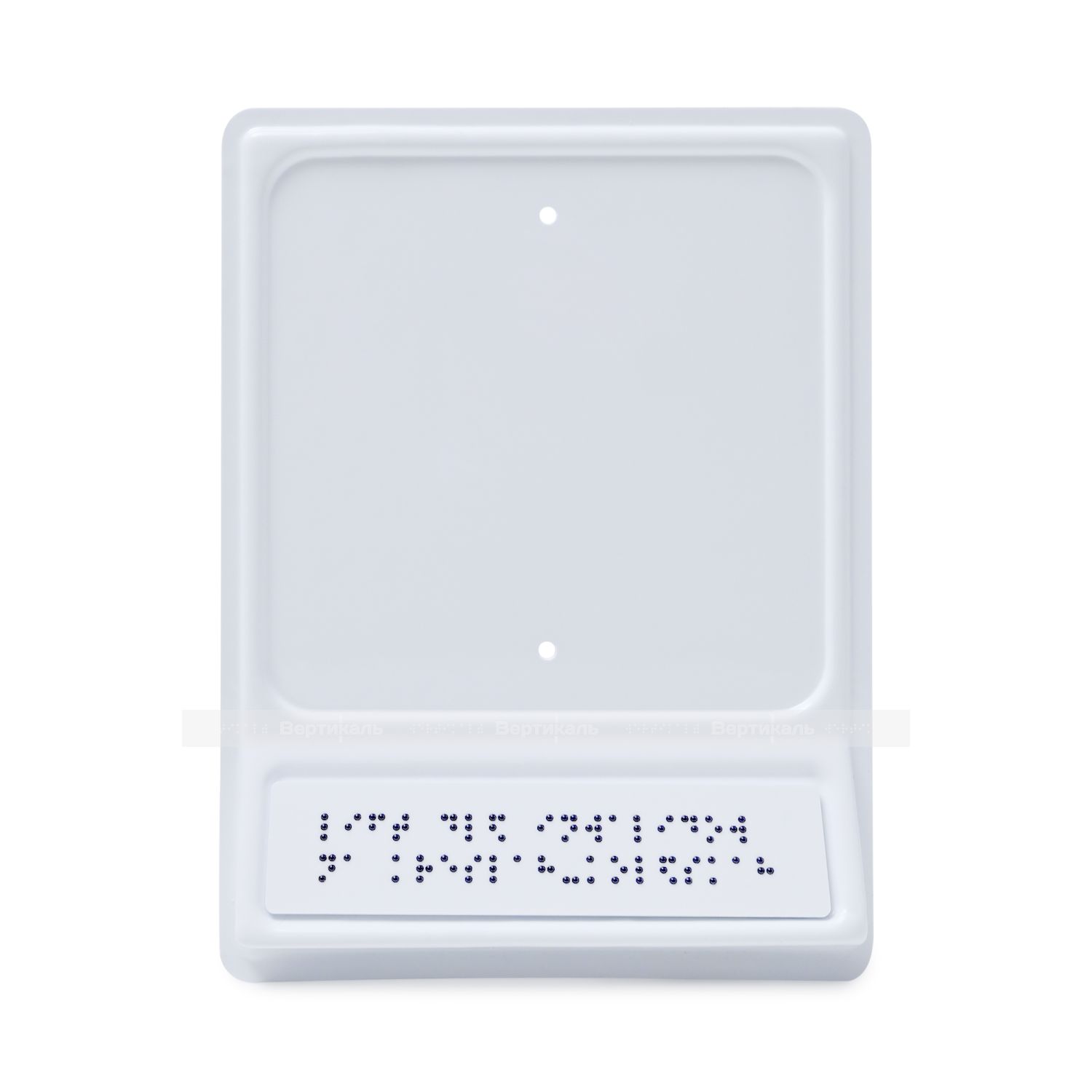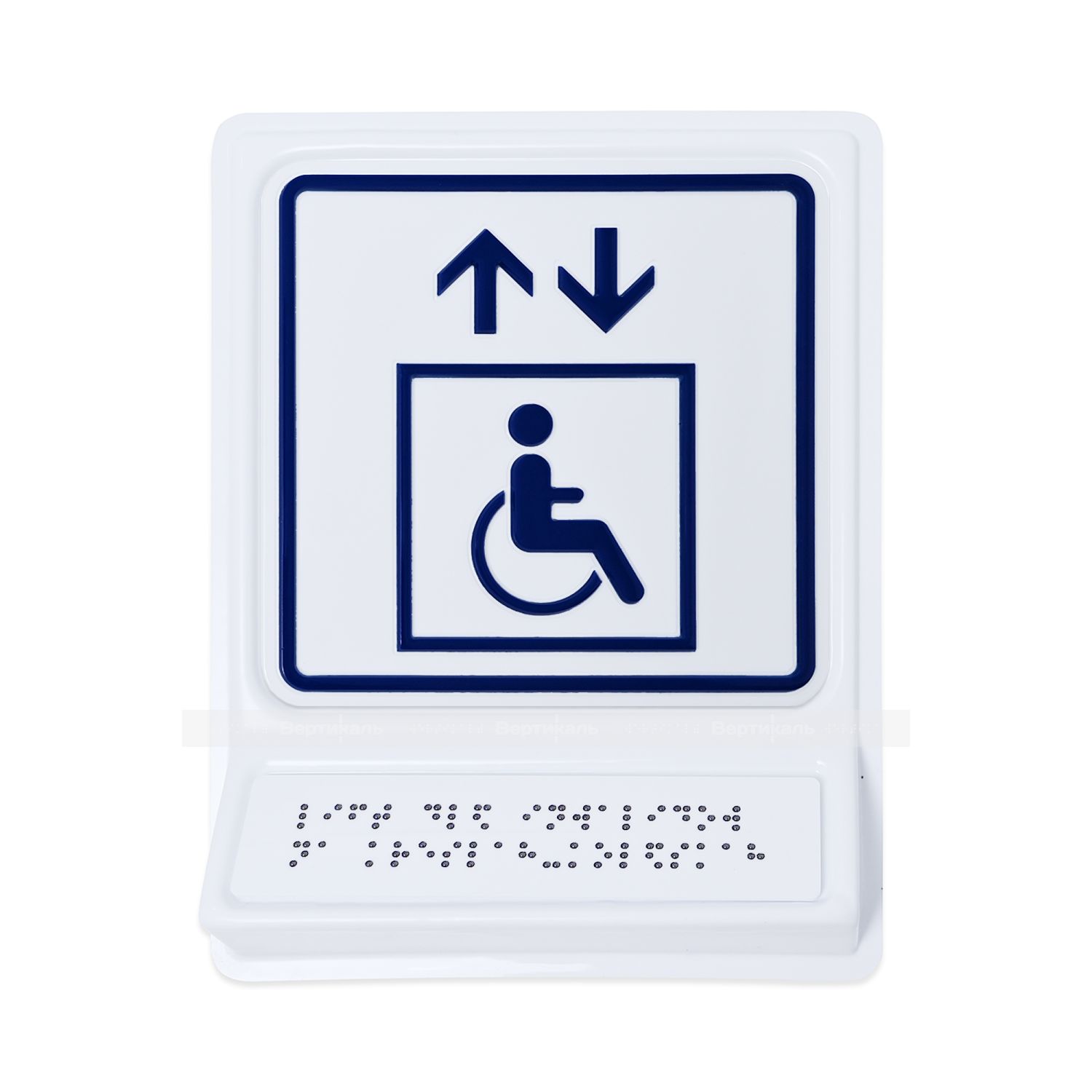 Тактильный указатель обозначающий лифт для инвалидов на креслах-колясках. Обладает тактильным эффектом для восприятия незрячими и слабовидящими людьми. Информация продублирована по системе Брайля на специальной наклонной площадке, что позволяет считывать информацию незрячему человеку значительно быстрее.