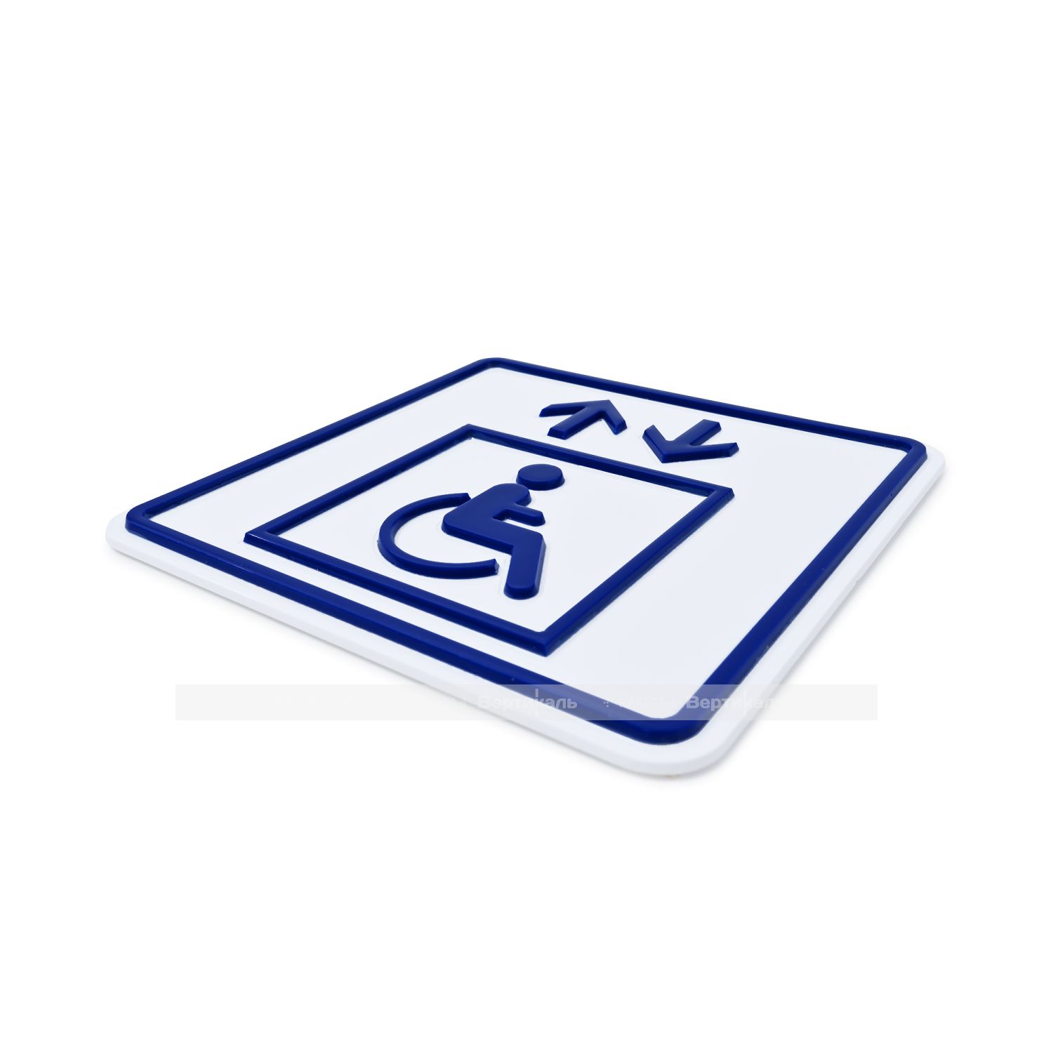 Пиктограмма с дублированием информации по системе Брайля на наклонной площадке «Лифт для инвалидов на креслах-колясках», синяя, 240х180х30 мм