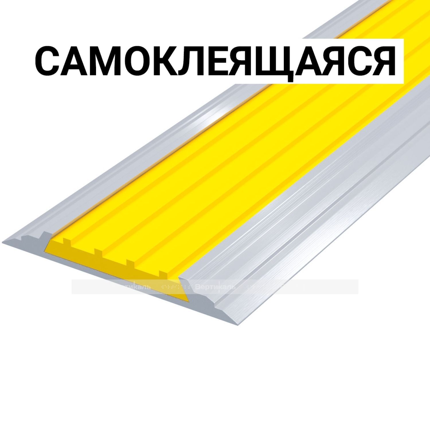 Лента тактильная направляющая, антивандальная, в AL профиле ВхШхГ 46х4,5, материал вставки - ПВХ, шириной 29мм желтого цвета, самоклеящаяся