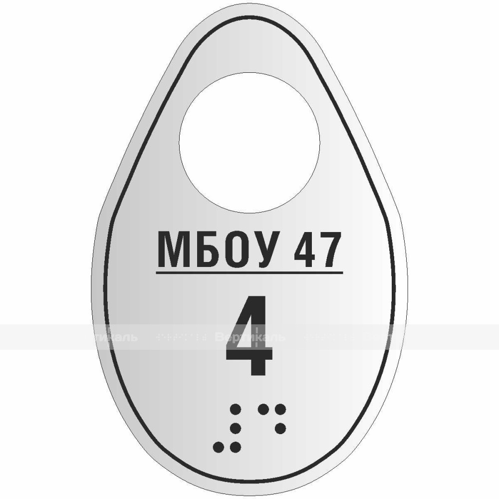 Гардеробные номерки тактильные криволинейной формы односторонние на основе ABS 2 мм с защитным покрытием «под серебро» 70х45 мм