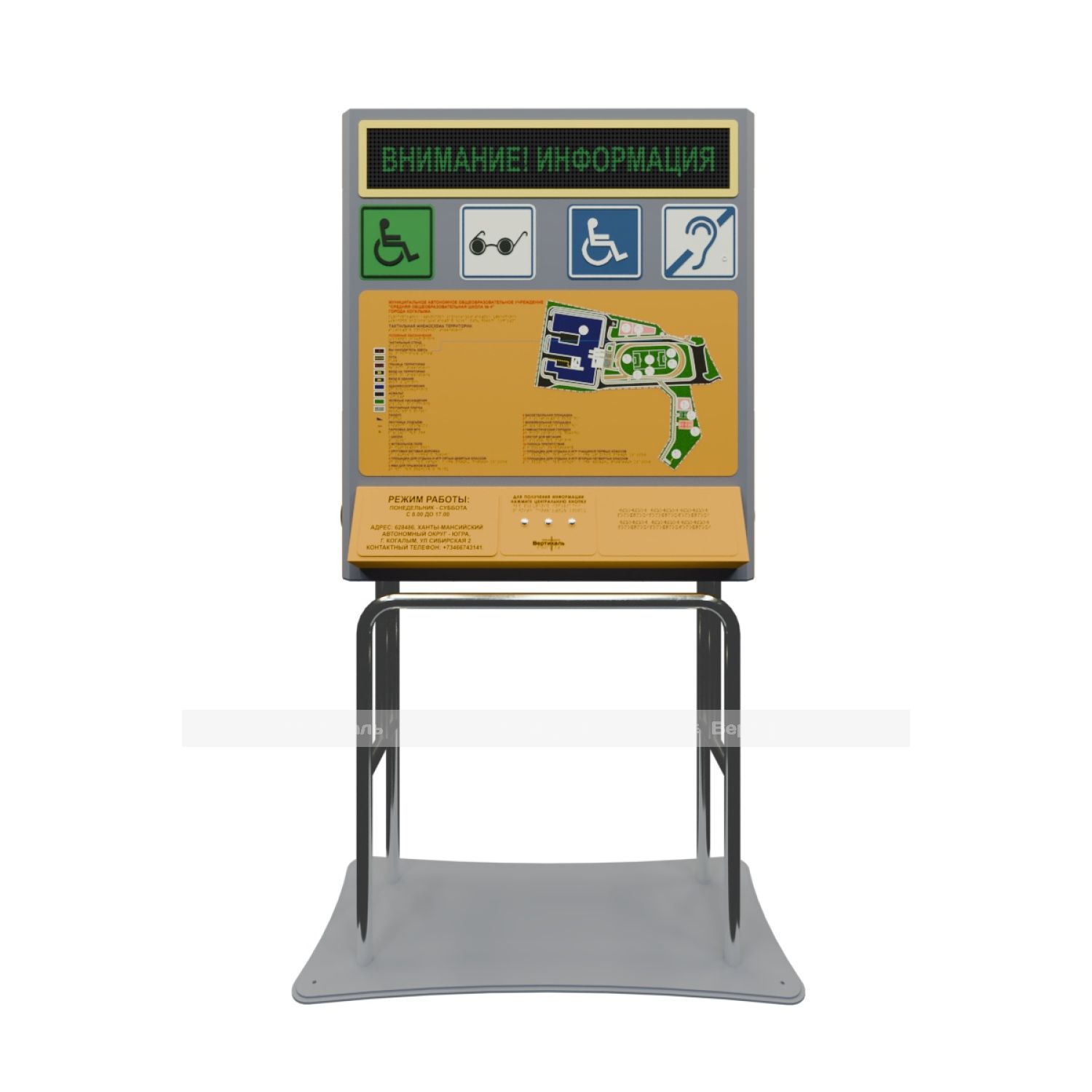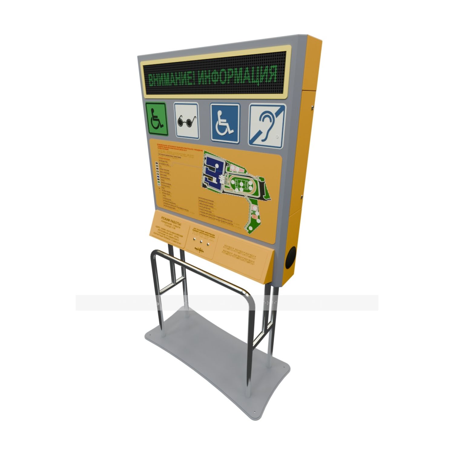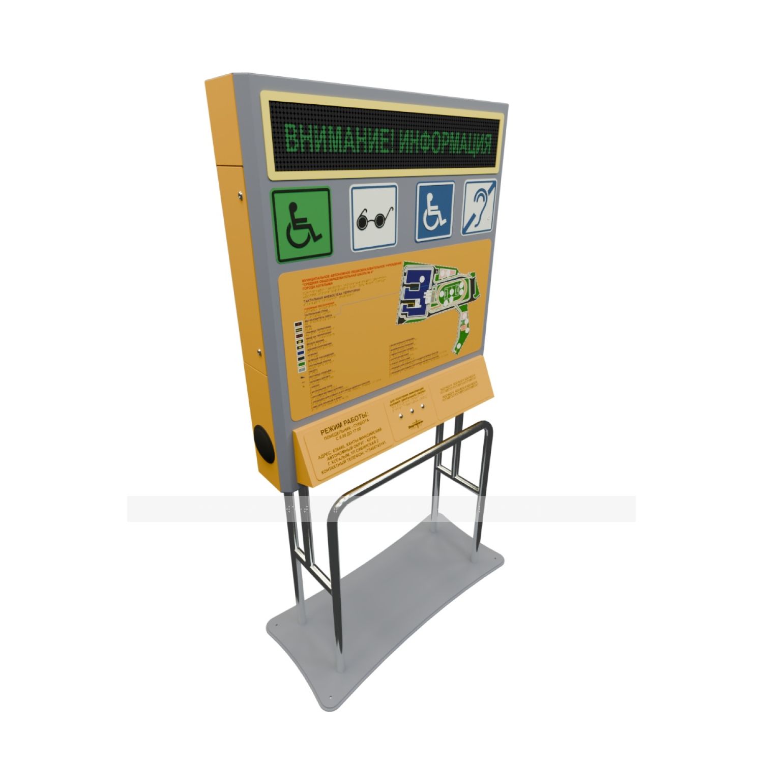 Тактильно-звуковая мнемосхема для входной группы с системой вызова помощи - это инновационное устройство, разработанное для обеспечения доступности и безопасности входной зоны или общественного места. Она предназначена для людей с ограниченными возможностями, в том числе для людей с нарушениями слуха, зрения или мобильности, чтобы обеспечить им равные возможности и комфортное взаимодействие с окружающей средой.