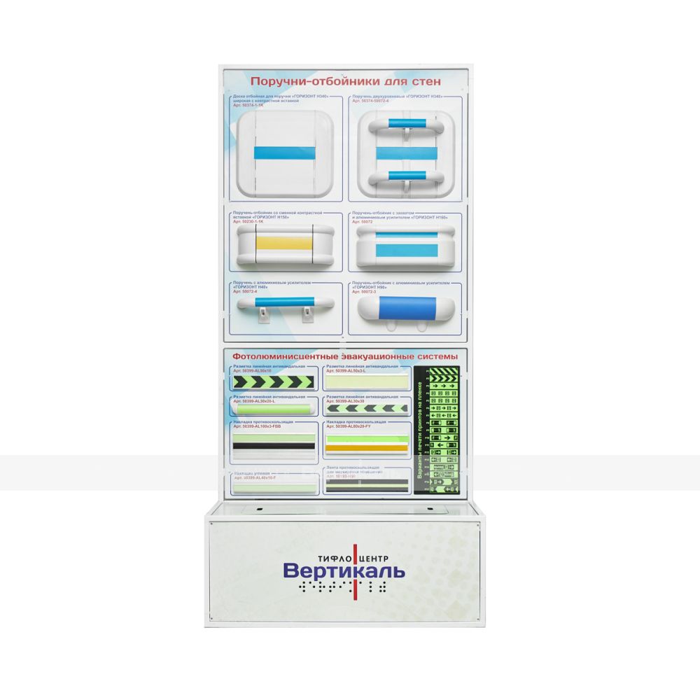 Данный стенд наглядно демонстрирует все разновидности поручней-отбойников и фотолюминесцентных эвакуационных систем производства Тифлоцентра "Вертикаль".
