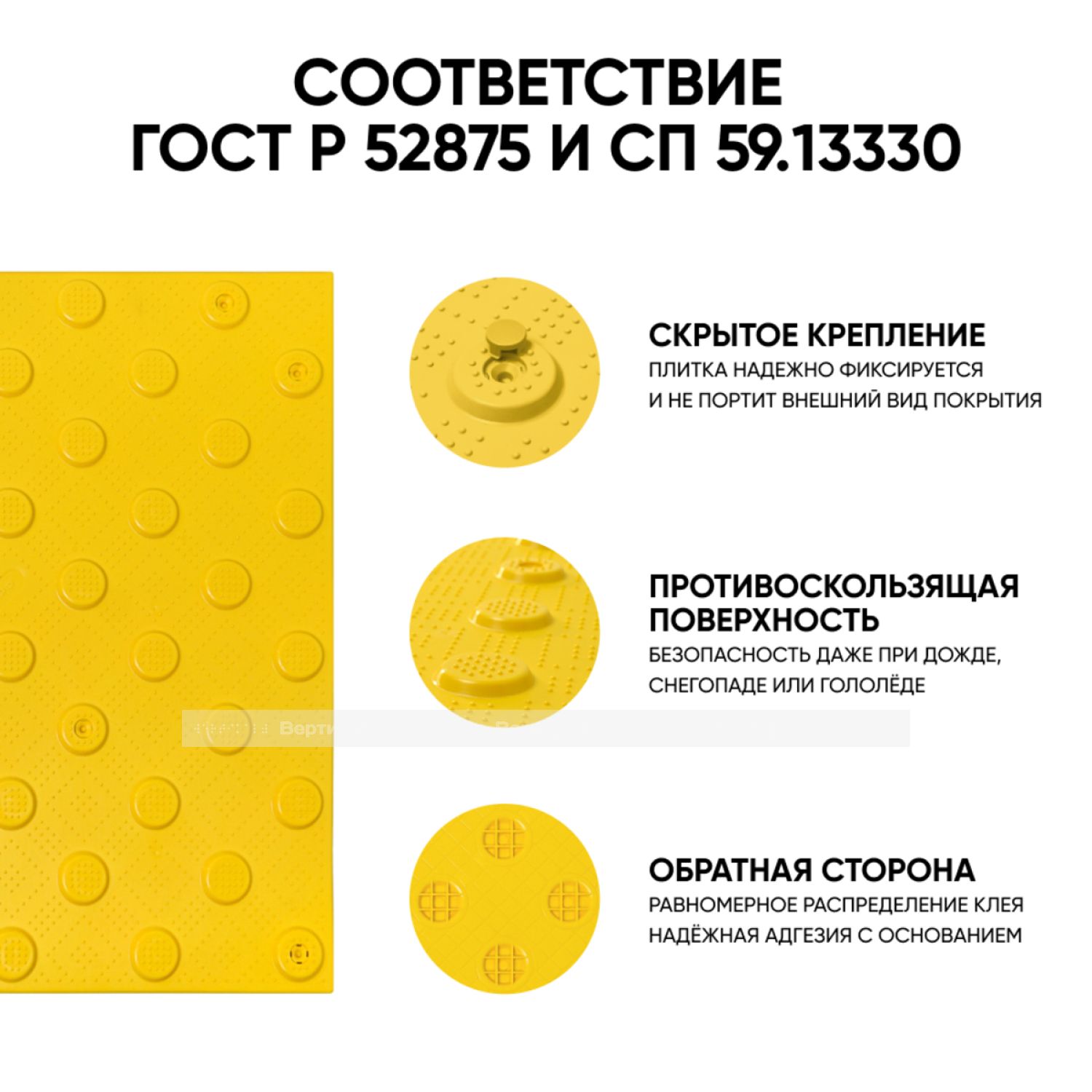 Тактильная полиуретановая плитка выполнена в соответствии с ГОСТ Р 52875-2018, изготовлена из высококачественного полиуретана твёрдостью не более 85 ед. по Шору по таблице А. Материал обладает высокой прочностью, устойчив к перепадам температур, влагостоек и имеет относительные грязеотталкивающие свойства, благодаря чему плитка подходит для монтажа как внутри помещений, так и снаружи. Дополнительно реализовано противоскользящее покрытие, что обеспечивает безопасность использования на любых типах поверхностей.