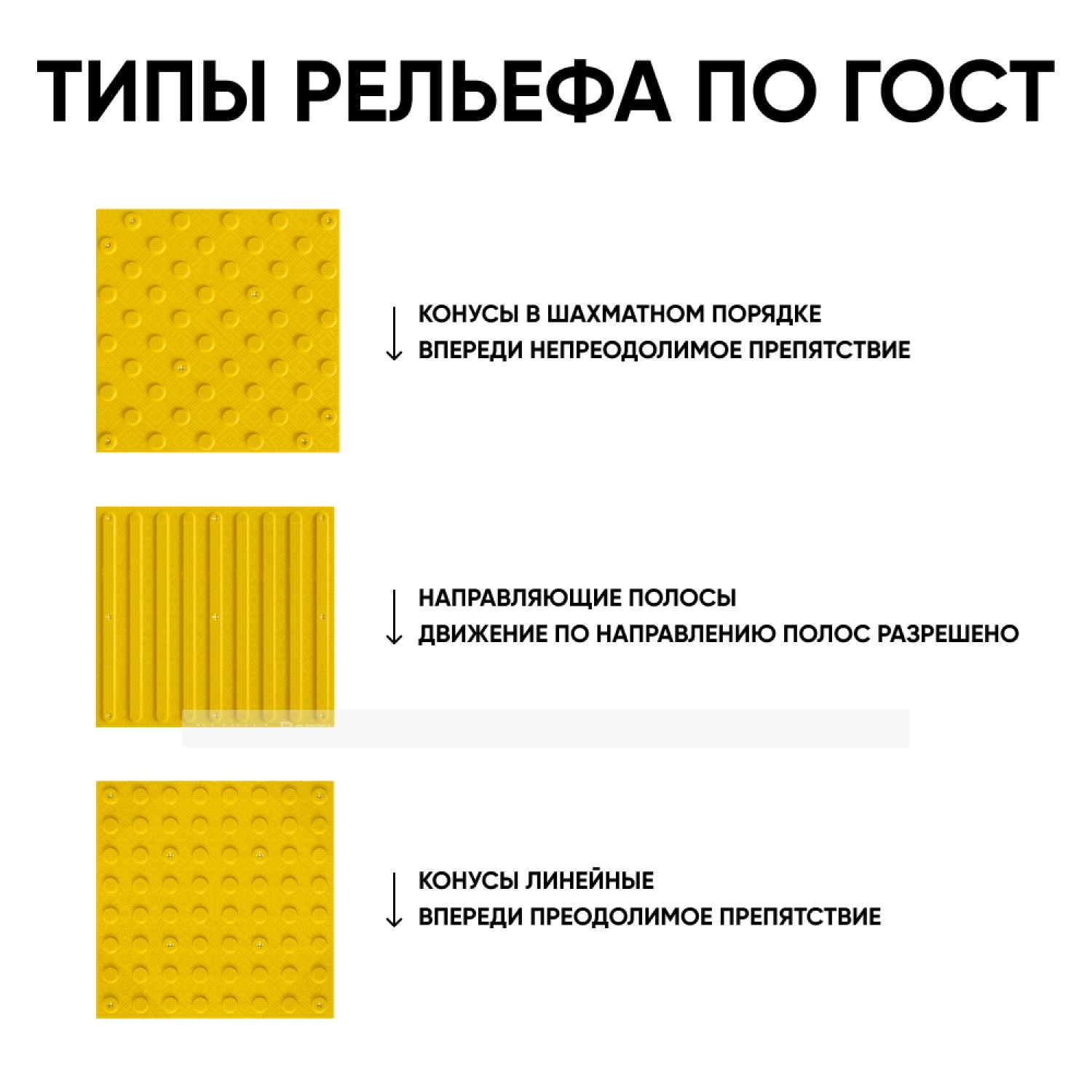 Тактильная полиуретановая плитка выполнена в соответствии с ГОСТ Р 52875-2018, изготовлена из высококачественного полиуретана, твёрдостью не более 85 ед. по Шору по таблице А. Материал отличается высокой прочностью, устойчивостью к перепадам температур, влагостойкостью и относительными грязеотталкивающими свойствами, поэтому плитка отлично подходит для укладки как внутри, так и снаружи помещений. Дополнительно реализовано противоскользящее покрытие, обеспечивающее безопасность эксплуатации на любых поверхностях.