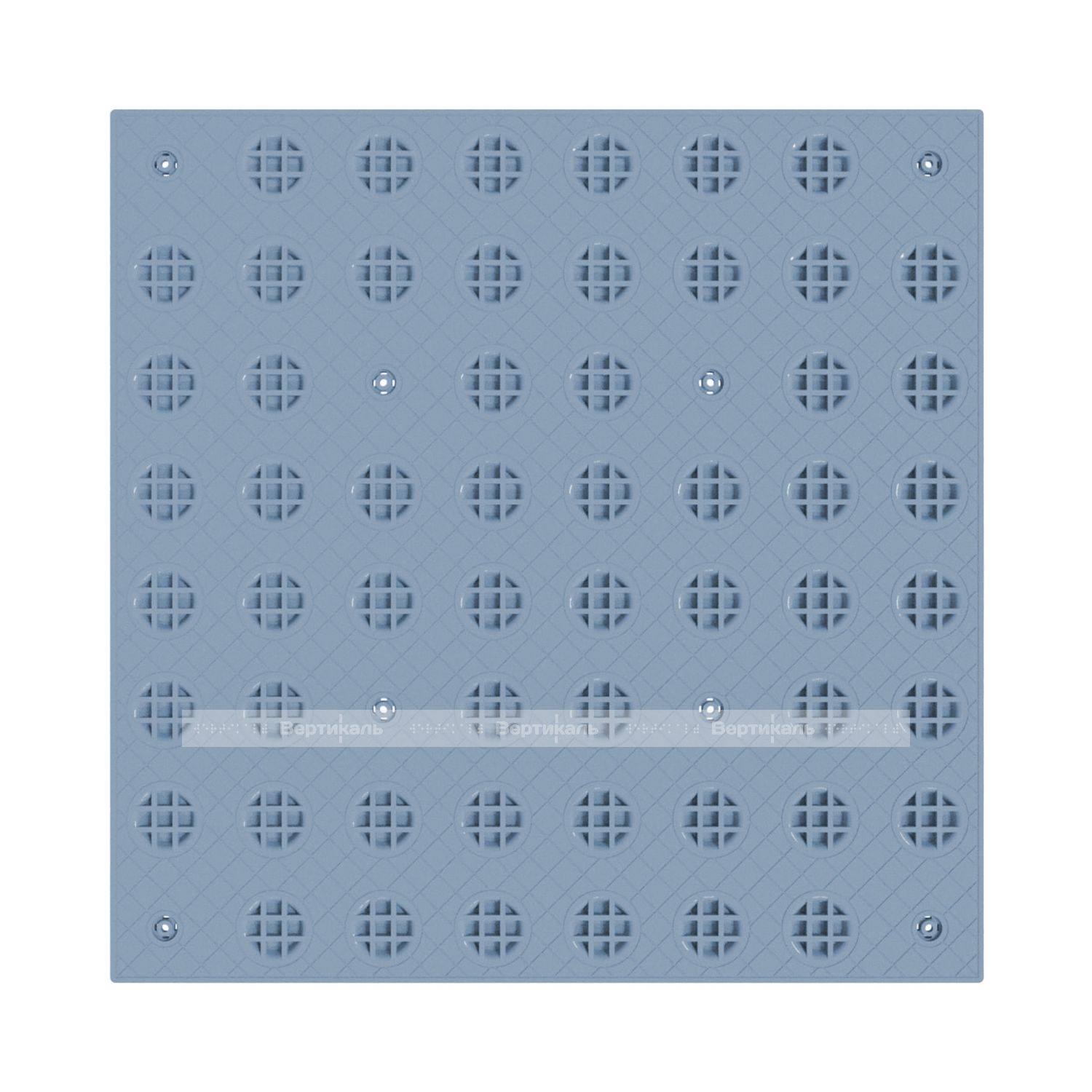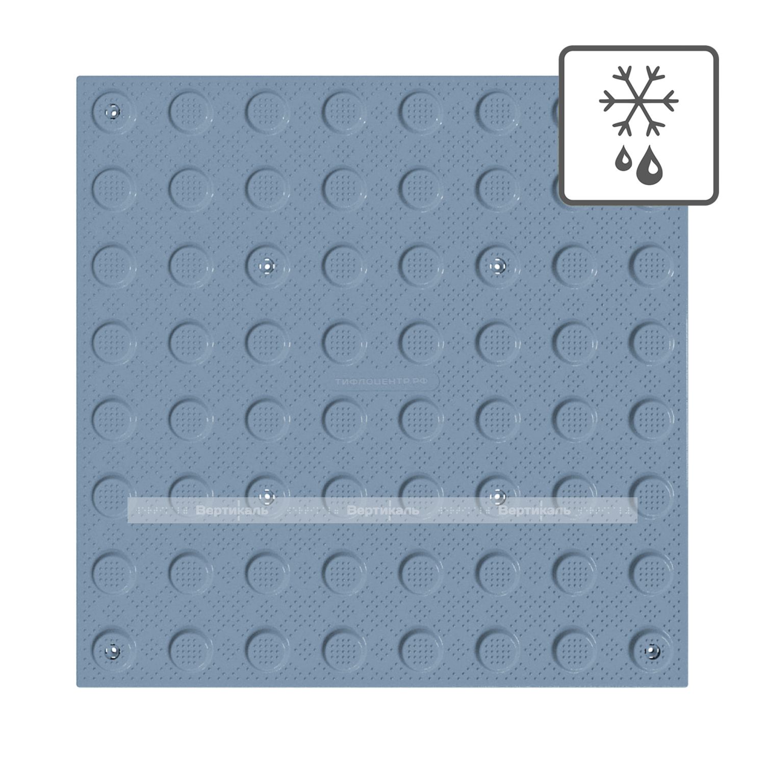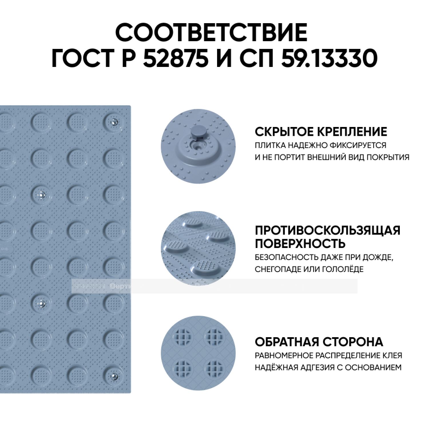 Не допускается применение изделий с более крупными ячейками, так как это значительно увеличит расход клеящего вещества. Для обеспечения контраста с подстилающей поверхностью, а также для обеспечения оптимальных условий восприятия цвета слабовидящим человеком, тактильная плитка имеет серый цвет поверхности. Плитка предназначена для монтажа при помощи клея на уже имеющееся напольное покрытие. Специалисты компании "Вертикаль" рекомендуют использовать специальный клей FIXVERT. Тактильная плитка от компании "Вертикаль" рекомендована к применению ВОС и гос. программой "Доступная среда".
