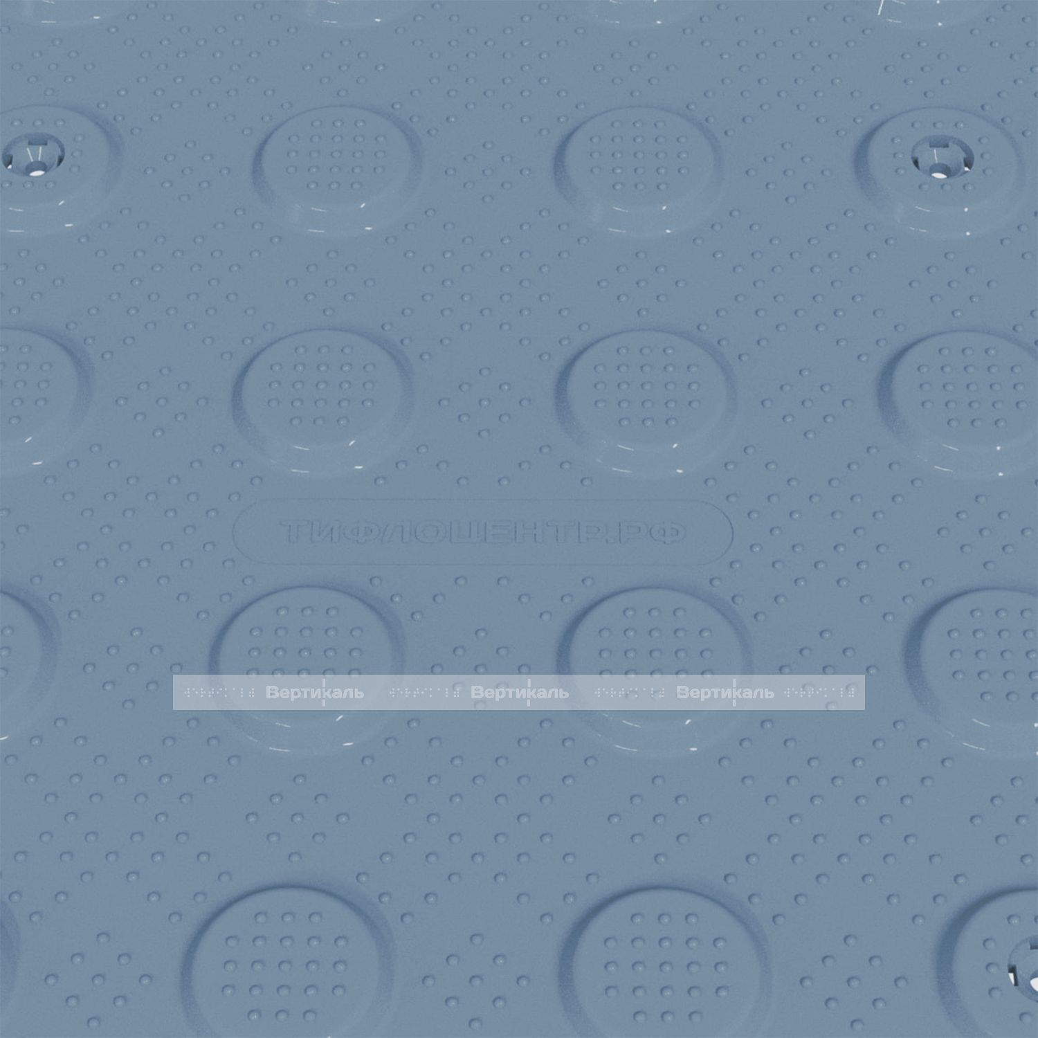 Тактильная плитка выполнена в соответствии с ГОСТ Р 52875-2018, представляет собой изделие из литого ПВХ материала твёрдостью по Шору не более 98 ед. по шкале А, что обеспечивает достаточно высокие прочностные характеристики и предотвращает образование заломов на плитки в процессе укладки; поверхность имеет противоскользящий литой микрорельеф для безопасной эксплуатации в помещениях.