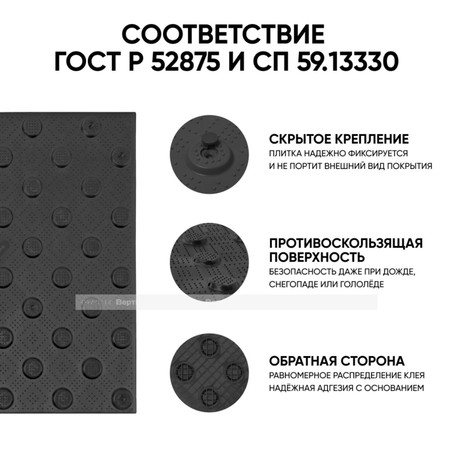 Тактильная плитка выполнена в соответствии с ГОСТ Р 52875-2018, представляет собой изделие из литого ПВХ материала твёрдостью по Шору не более 98 ед. по шкале А. Материал обладает достаточной прочностью, устойчивостью к влаге и износу, что предотвращает образование заломов при укладке и обеспечивает длительный срок эксплуатации. Дополнительно плитка оснащена противоскользящей поверхностью с литым микрорельефом, что делает её безопасной для использования в помещениях.