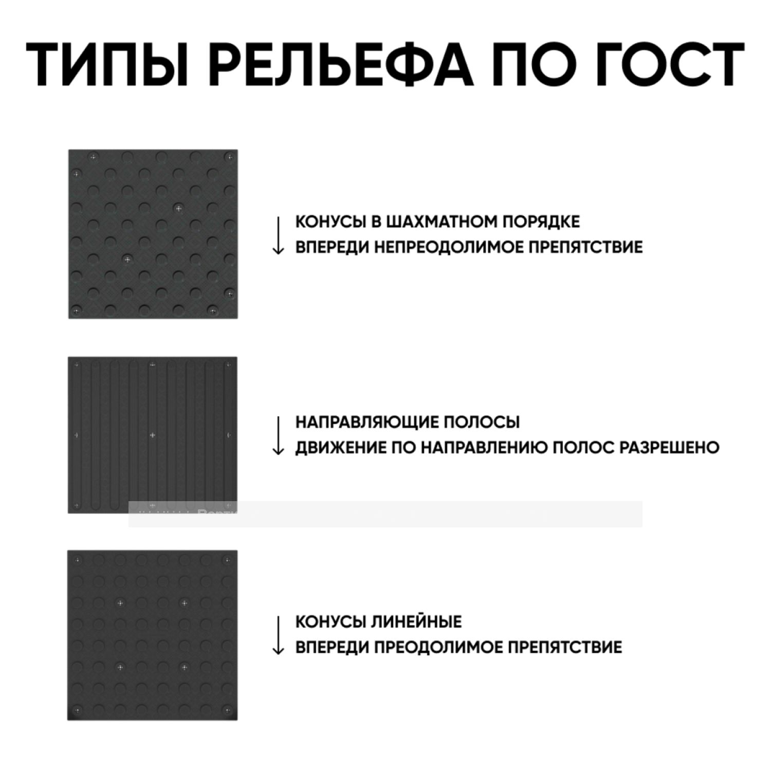 Тактильные рифы, выполненные в виде усечённых конусов, расположенных в шахматном порядке, информируют незрячего или слабовидящего человека о наличии непреодолимого препятствия на пути следования. Для увеличения срока службы внутренняя поверхность конусов усилена рёбрами жёсткости цельнолитой конструкции толщиной не менее 1 мм с размером ячеек не более 5х5 мм, числом не менее 4 шт., что обеспечивает равномерное распределение клеящего вещества и прочную адгезию изделия с основанием. Конструктивные параметры предусматривают толщину основания 2 мм и высоту рифа 5 мм, а также скрытое крепление для надёжной фиксации.
