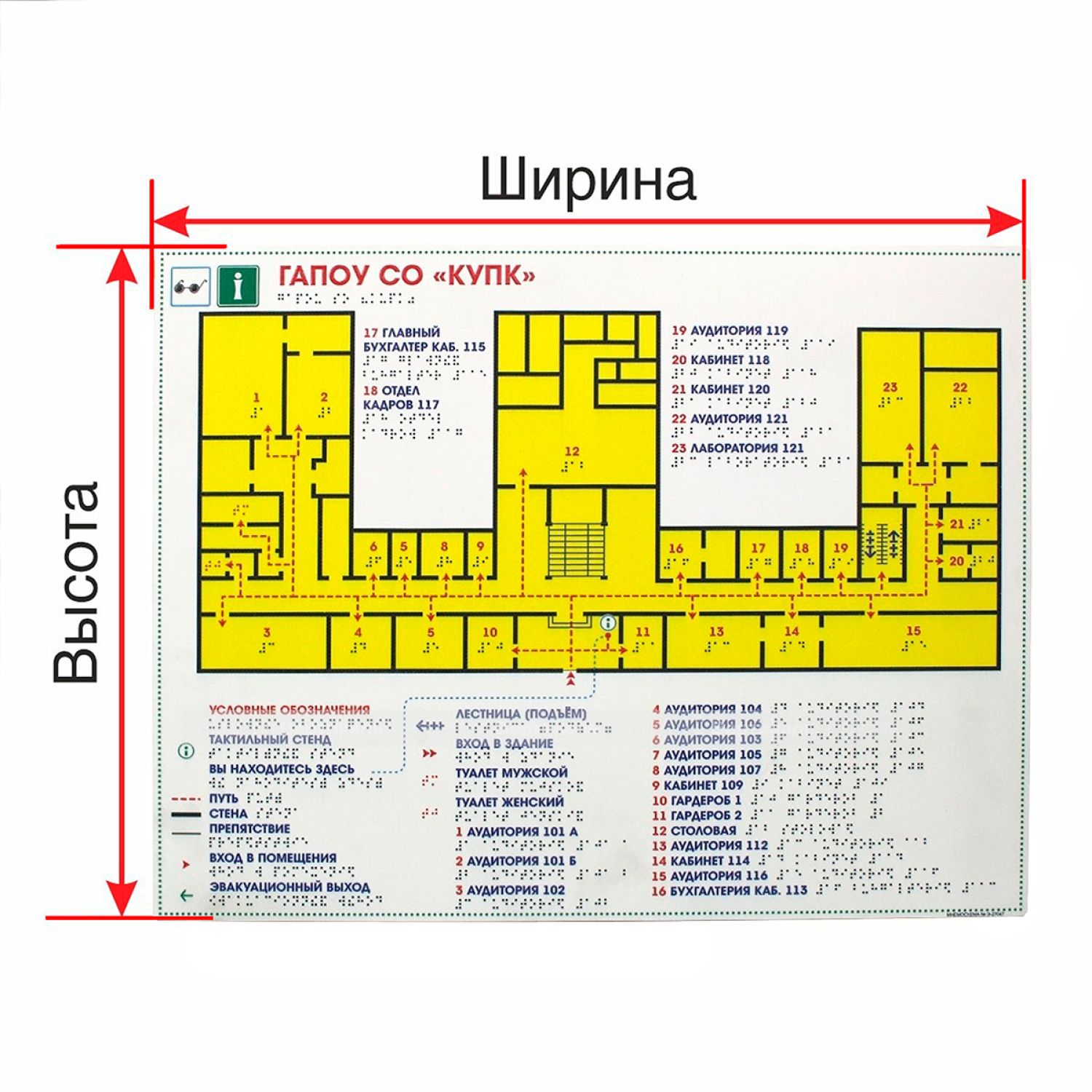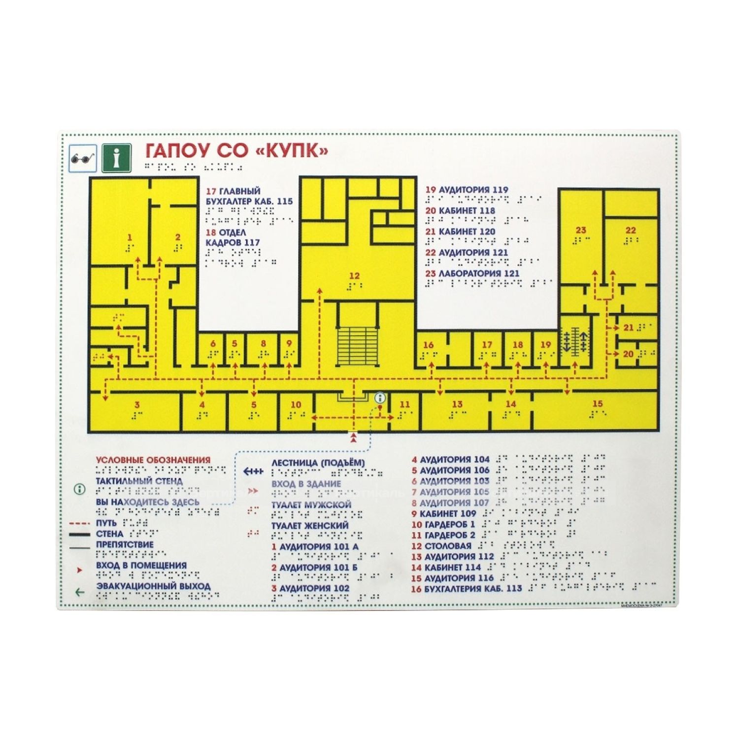 Тактильная мнемосхема — это план объекта, предназначенный для ориентирования МГН с нарушениями зрения. Изделие отображает информацию тактильным и визуальным способом. На мнемосхеме расположен тактильный план помещения или территории, а в специальной зоне — описание представленной информации плоскопечатным шрифтом и шрифтом Брайля.