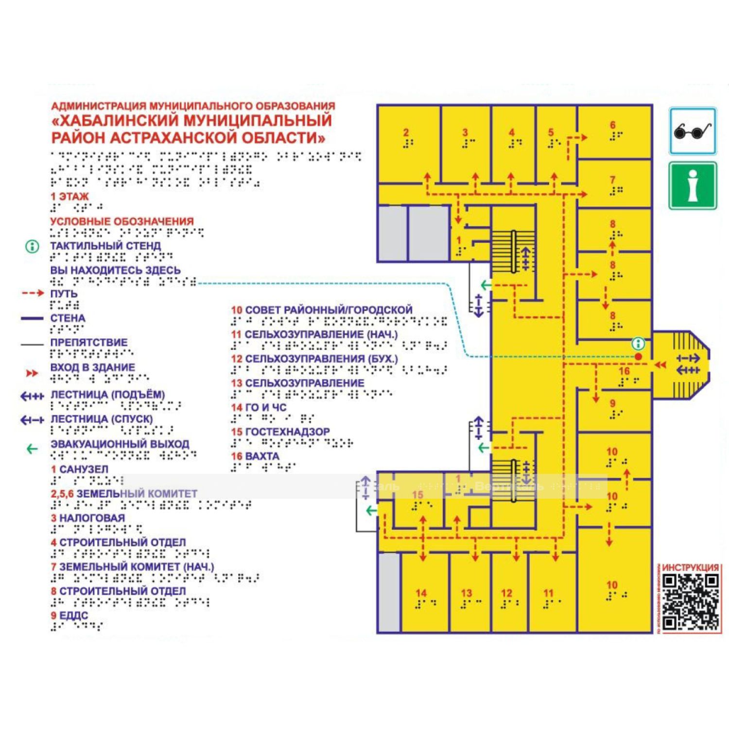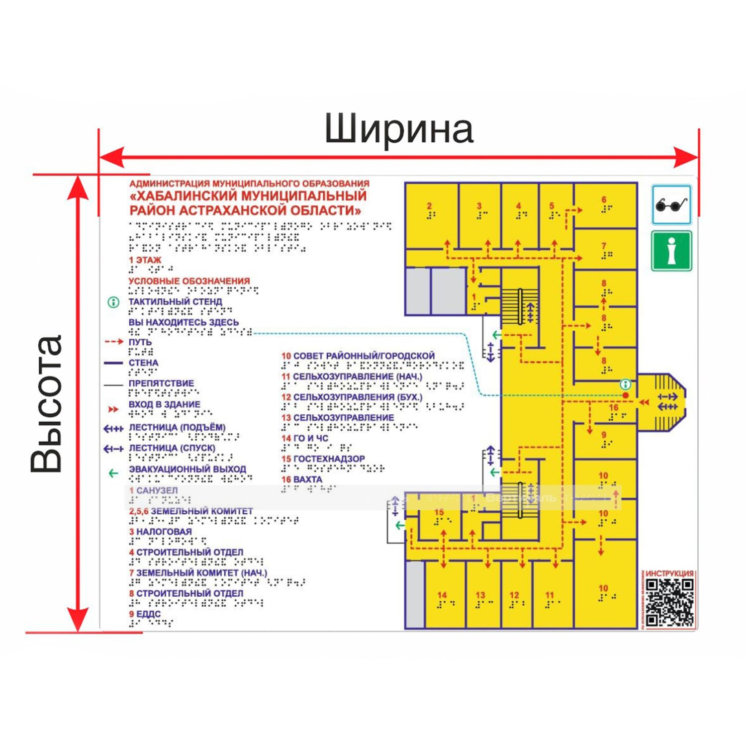 Тактильная мнемосхема – это особенное тифлотехническое средство для пространственного ориентирования людей с ограничениями по зрению, выполненная с применением тифлографической схемы и текстовой информации, дублируемой по системе Брайля. Мнемосхема легко монтируется, как на настенное крепление, так и на вертикальную стойку, что позволяет разместить её в любом помещении наиболее подходящим способом. Монохромные тактильные мнемосхемы являются экономичным решением адаптации пространства для незрячих людей. Мнемосхемы по системе Брайля являются важным элементом тактильной адаптации помещений для незрячих. Регламентируется нормативным документом СП 59.13330.2020. Выполнено по ГОСТ Р 56832-2020.