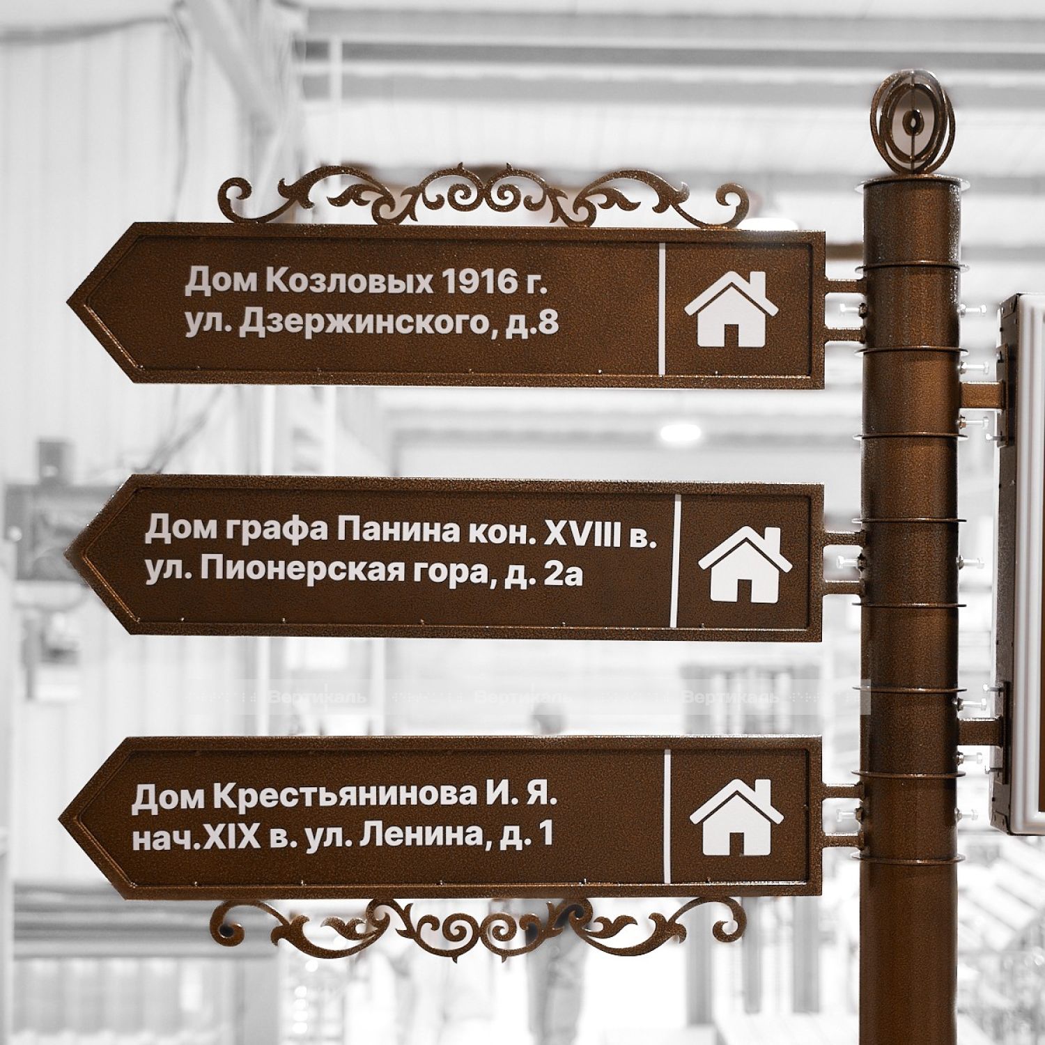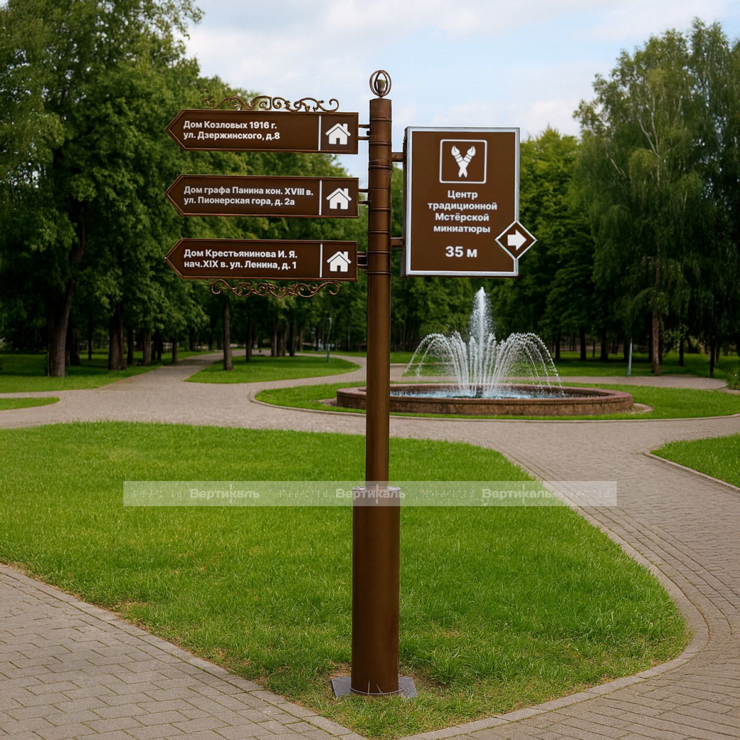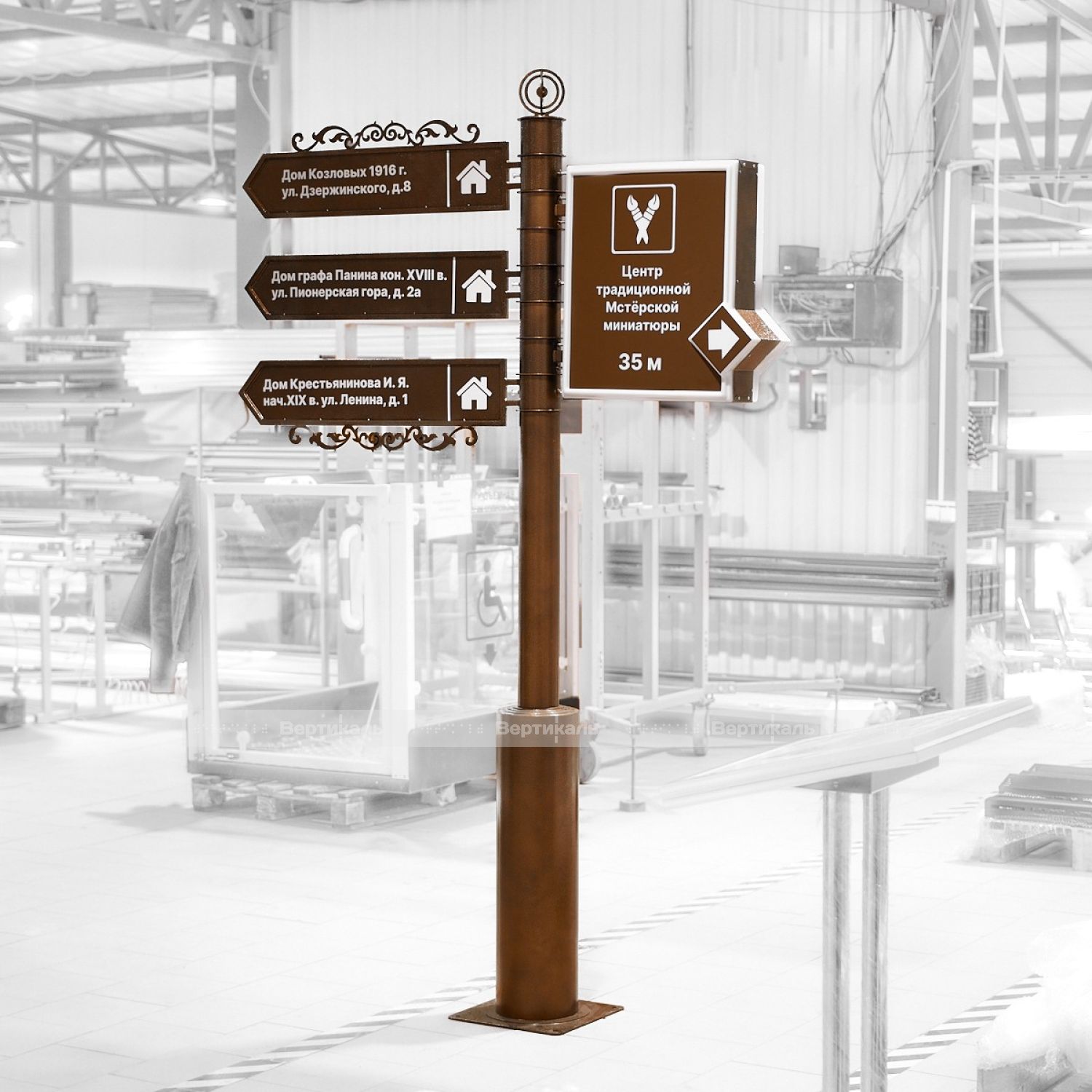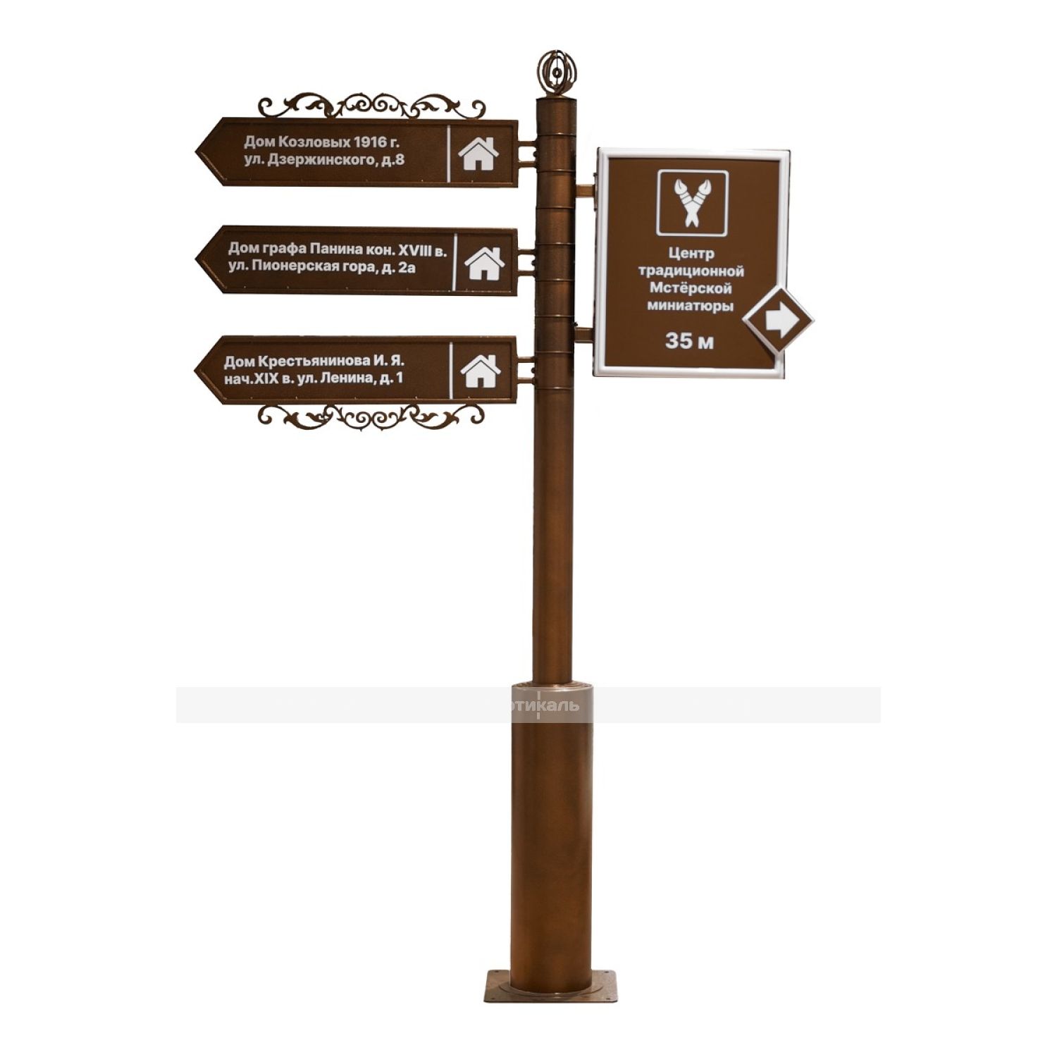 Туристический указатель разработан в стилистике старинной архитектуры, оснащен тремя вращающимися секциями и подсвечиваемым модулем с возможностью изменения ориентации. Эта особенность обеспечивает удобство установки и эксплуатацию в разных городских пространствах. Компактные размеры (2470×1725 мм) позволяют размещать изделие в местах с ограниченными площадями, таких как скверы, садово-парковые зоны, торговые комплексы и офисные здания.