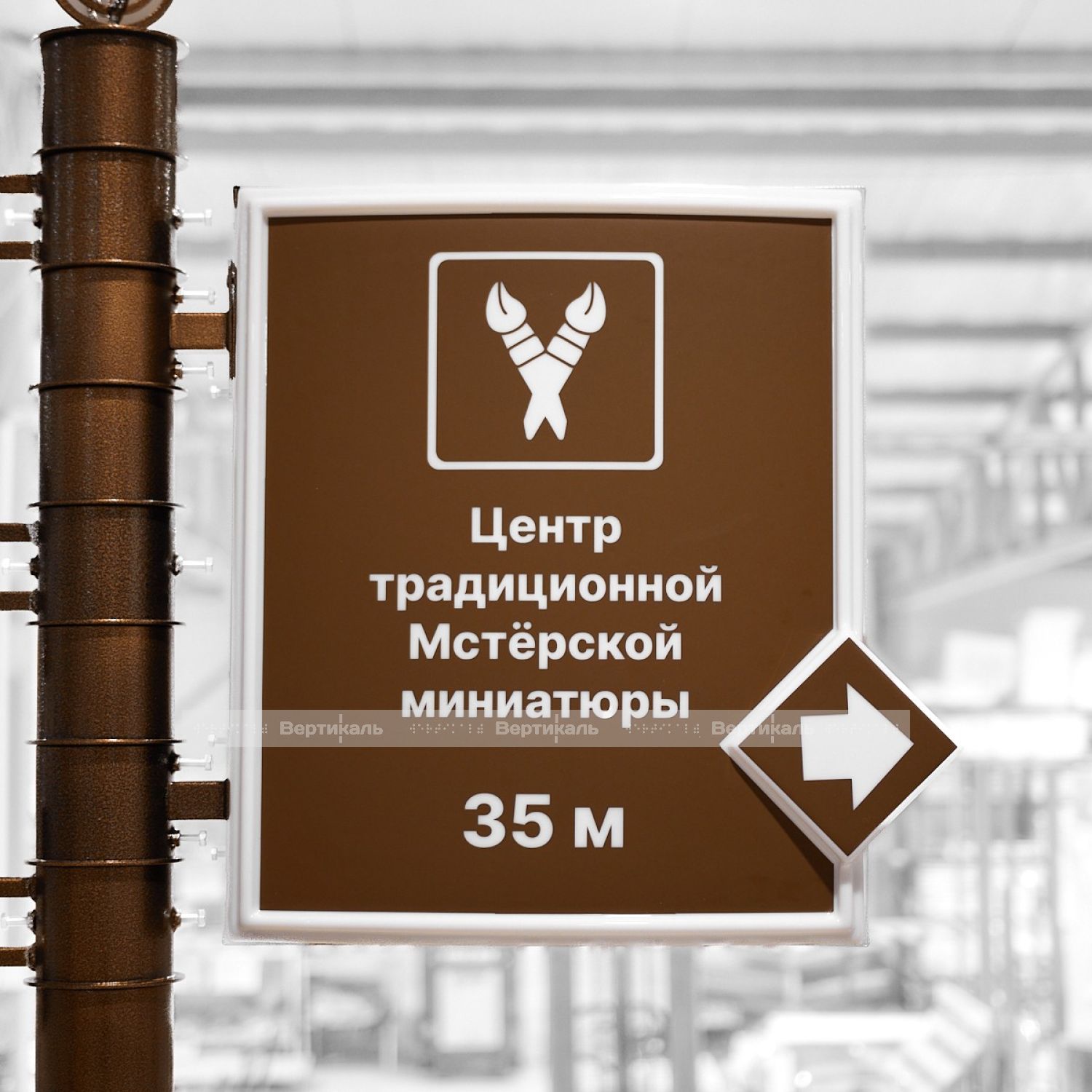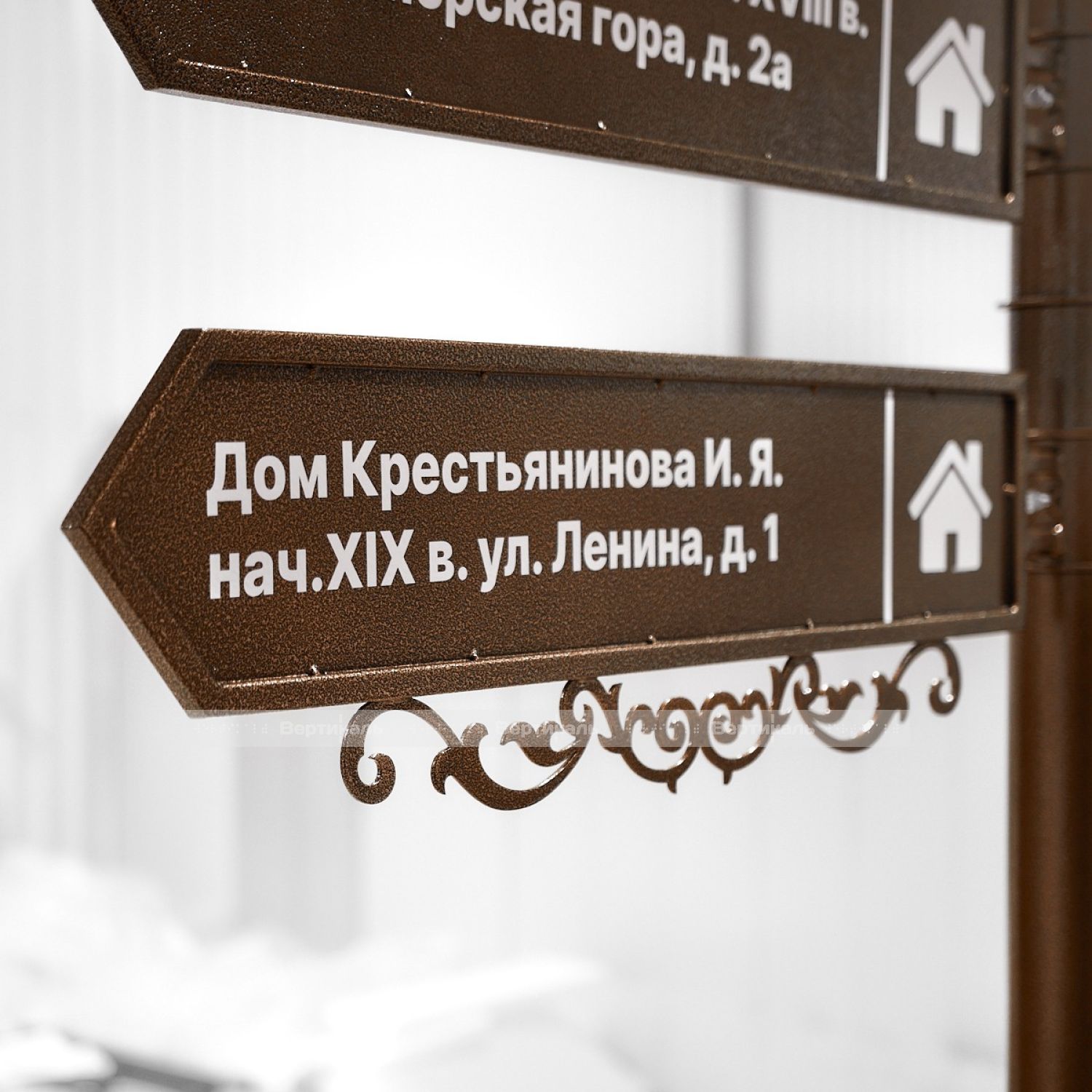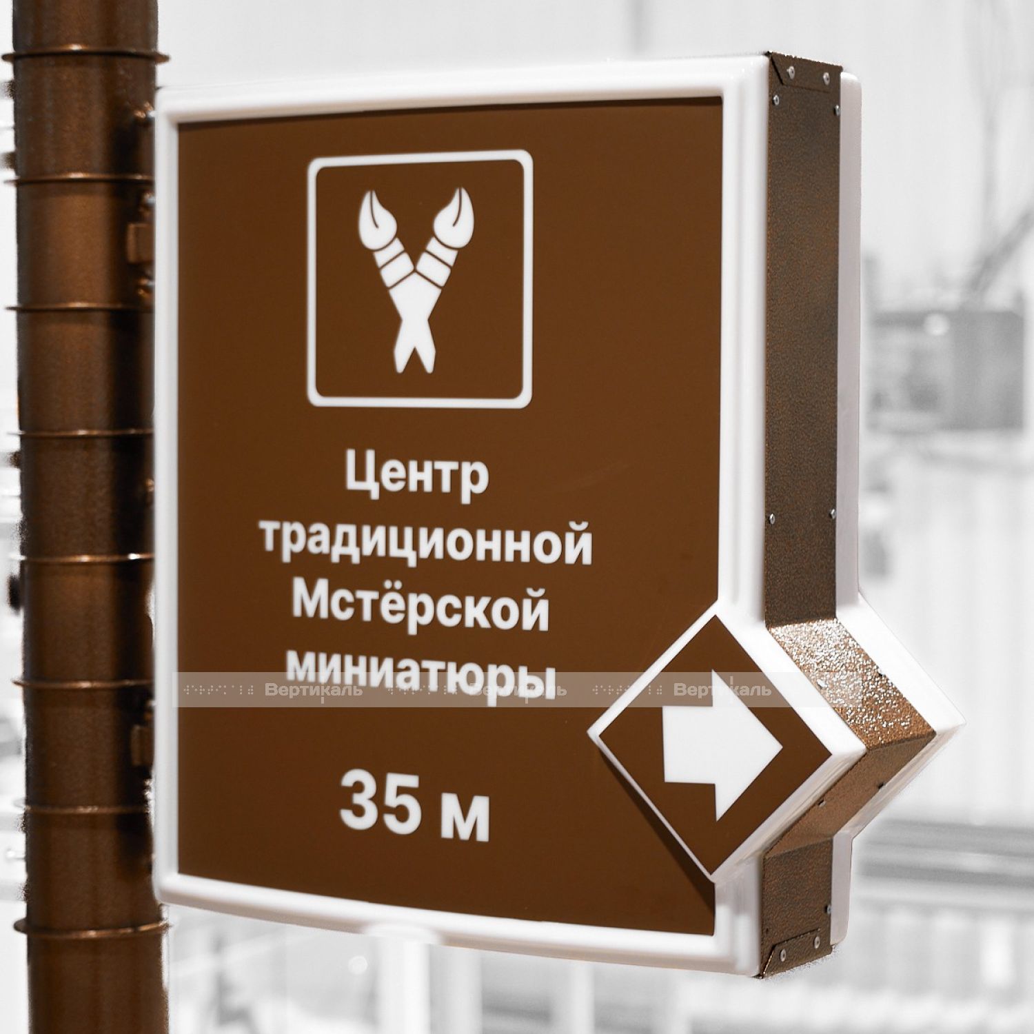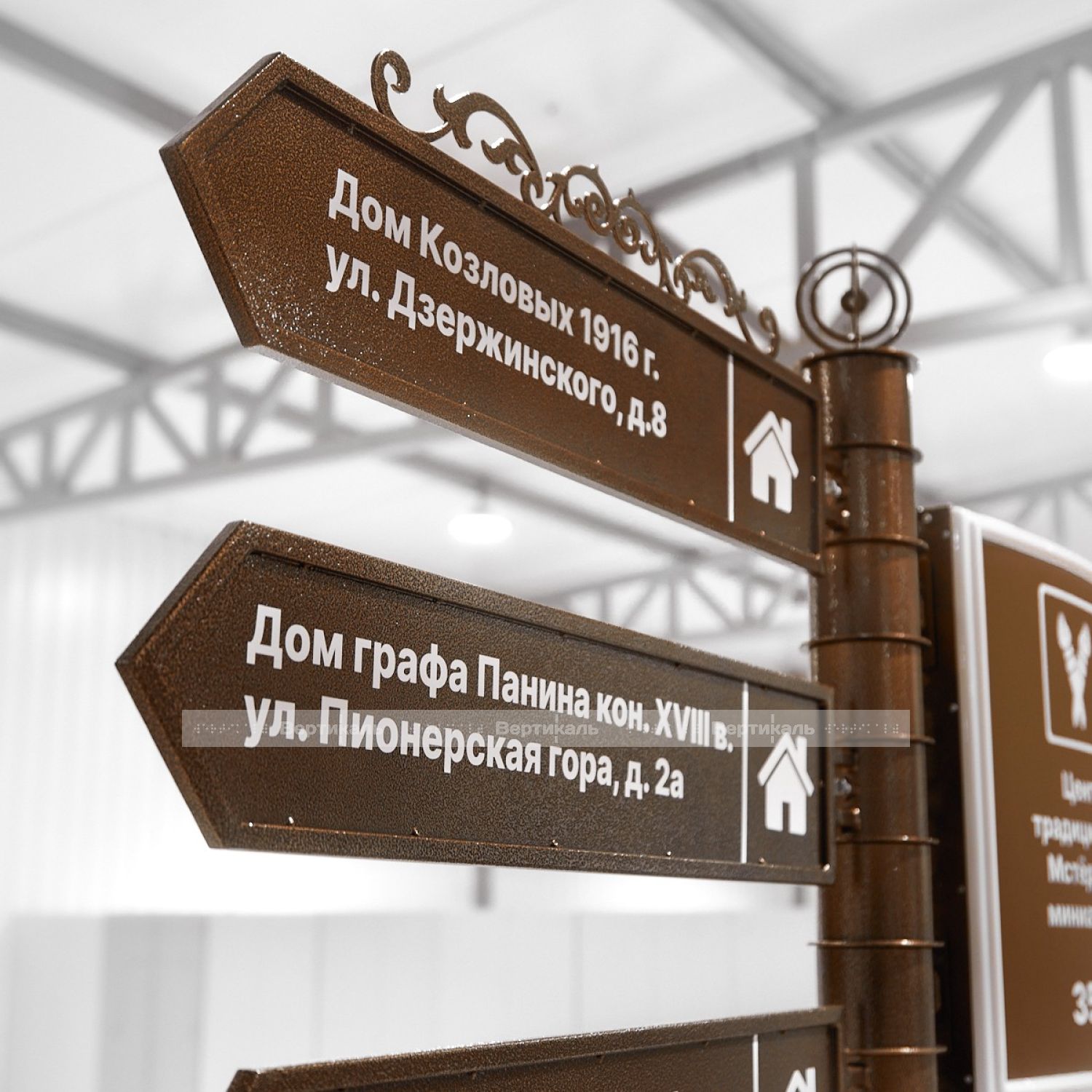 Туристический указатель разработан в стилистике старинной архитектуры, оснащен тремя вращающимися секциями и подсвечиваемым модулем с возможностью изменения ориентации. Эта особенность обеспечивает удобство установки и эксплуатацию в разных городских пространствах. Компактные размеры (2470×1725 мм) позволяют размещать изделие в местах с ограниченными площадями, таких как скверы, садово-парковые зоны, торговые комплексы и офисные здания.