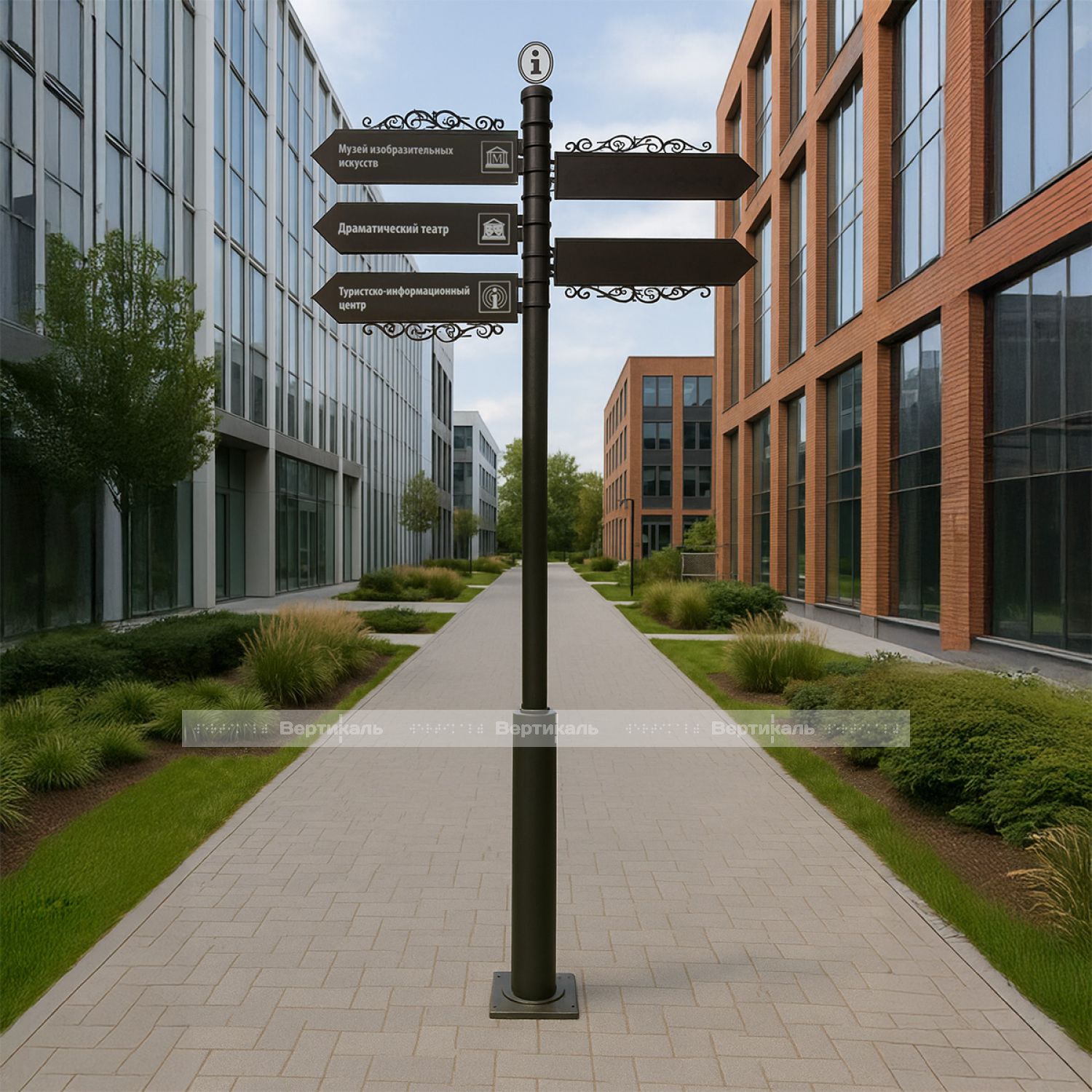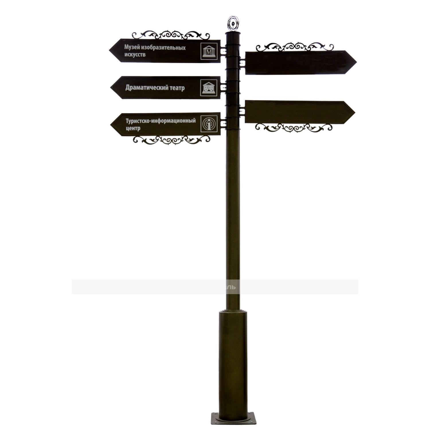 Городской указатель служит для навигации жителей и гостей, помогая быстро находить нужные объекты. Конструкция предусматривает поворотный механизм табличек, позволяющий легко обновлять информацию о направлениях без физического перемещения самого столба.