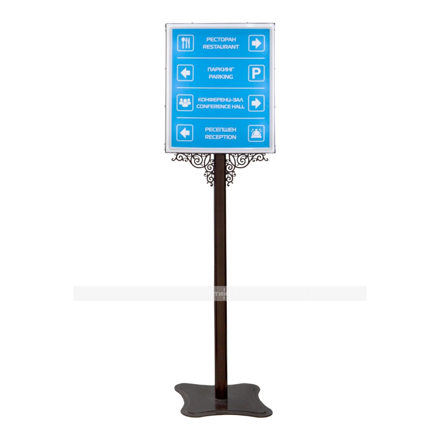 Конструкция светового короба на опоре выполнена в форме, имитирующей архитектурный стиль старых районов города, что придает ей особую привлекательность. Размещённая в парке или небольшом сквере, такая конструкция станет отличным источником рекламы либо информационной поддержки, одновременно обеспечивая дополнительное освещение прилегающей территории. Благодаря яркому свечения ночью, стойка хорошо заметна даже издалека.