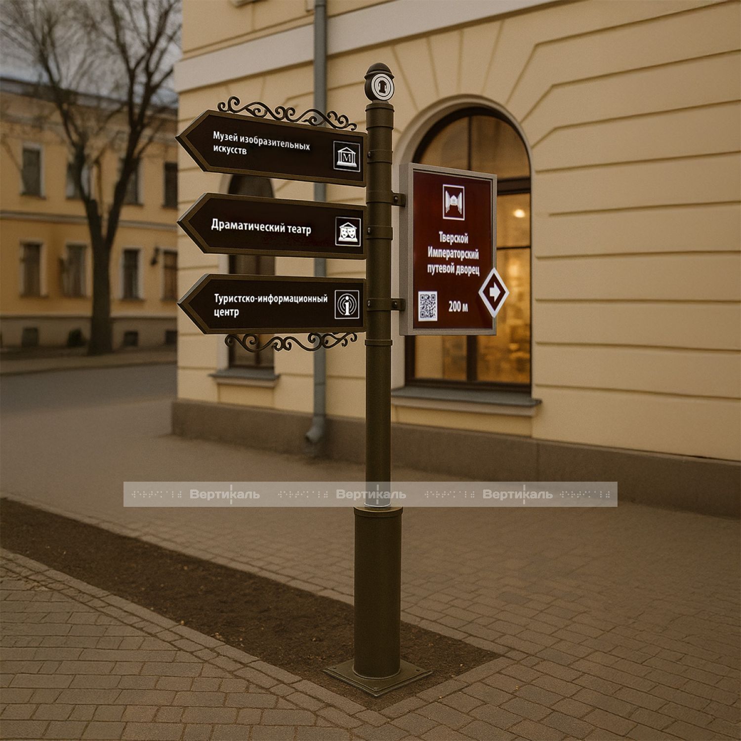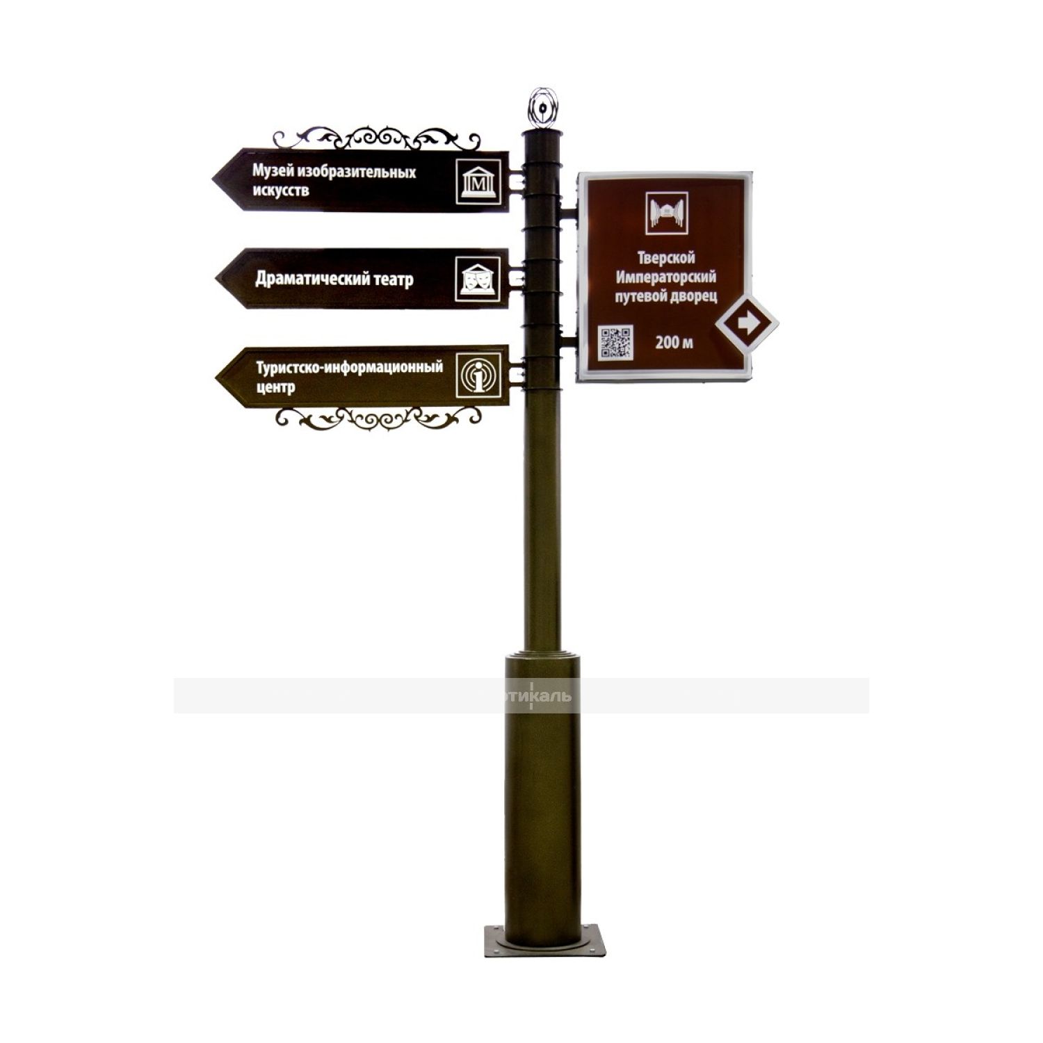 Туристический указатель воплощён в духе традиционной городской архитектуры, обладает поворотными сегментами для удобной адаптации к разным условиям использования. Этот вариант удачно совмещает функциональные возможности, стильный внешний облик и практическое удобство, становясь оптимальным решением для любых пространств, где требуется качественная поддержка посетителей посредством наглядной и доступной информации.