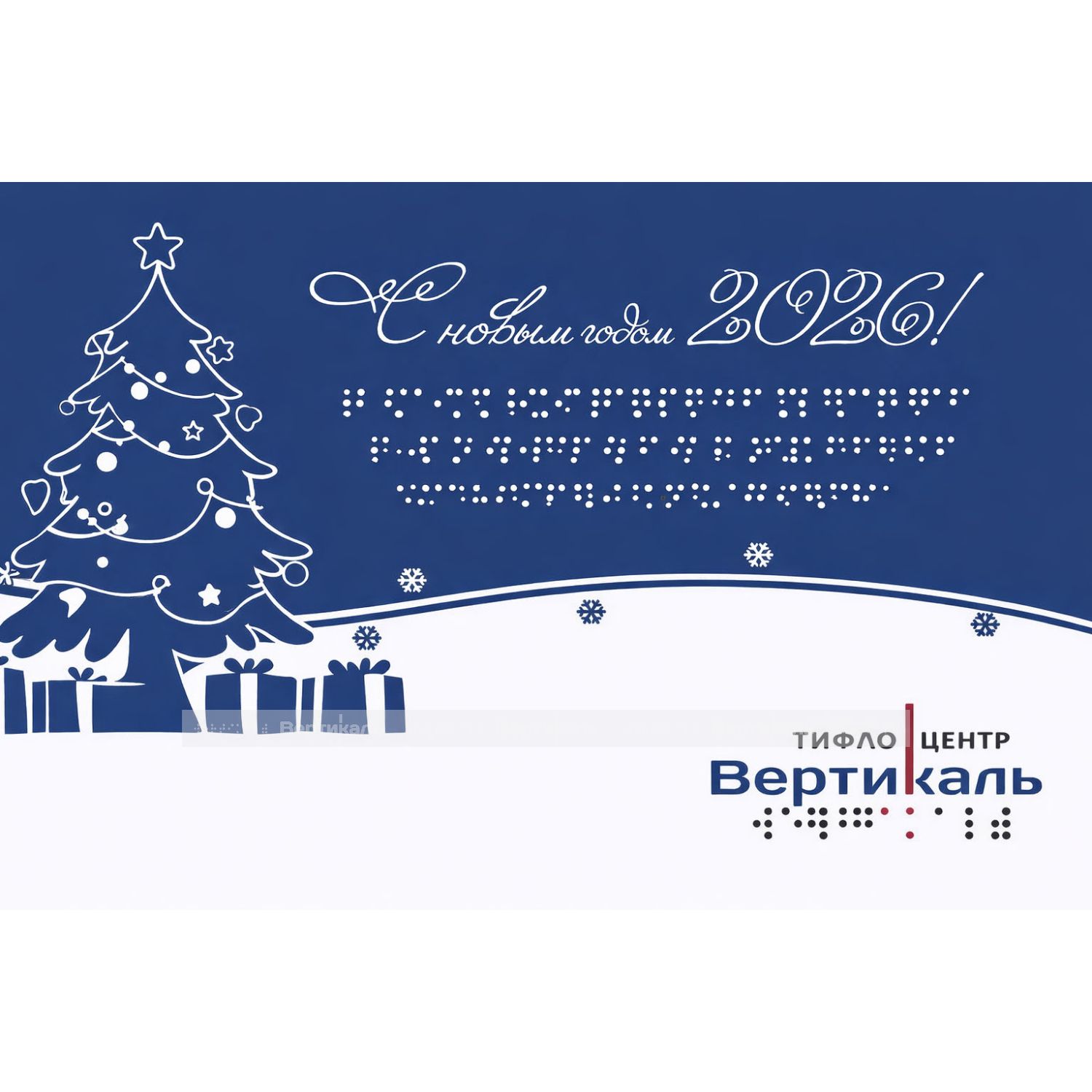 Тактильная открытка к Новому Году разработана специально для незрячих людей, имеет объемные элементы и продублирована шрифтом по системе Брайля.
