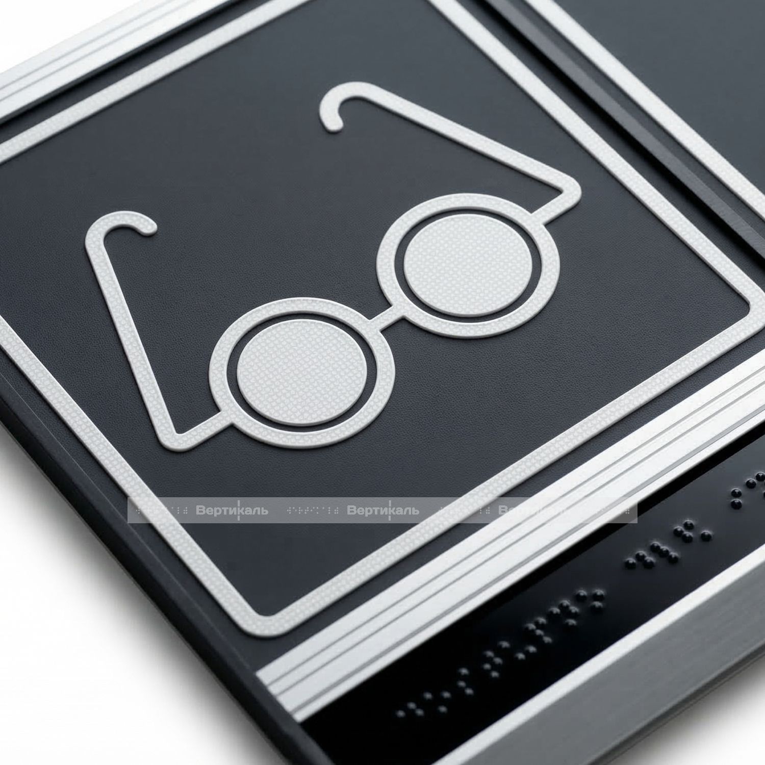 Модульная пиктограмма выполнена в алюминиевой рамке с наклонным информационным тактильным полем, содержит название, указанное рельефно-точечным шрифтом Брайля, с углом наклона 150° по отношению к рельефно-визуальной зоне.