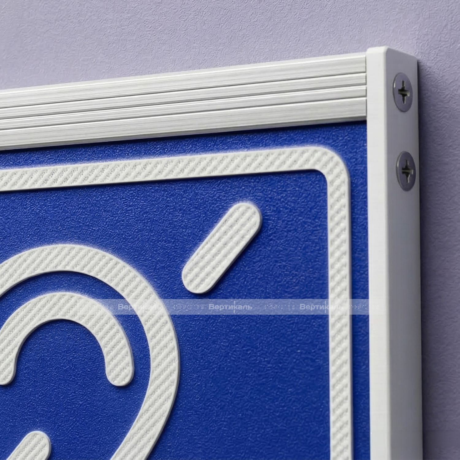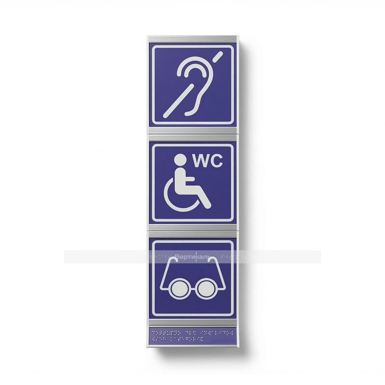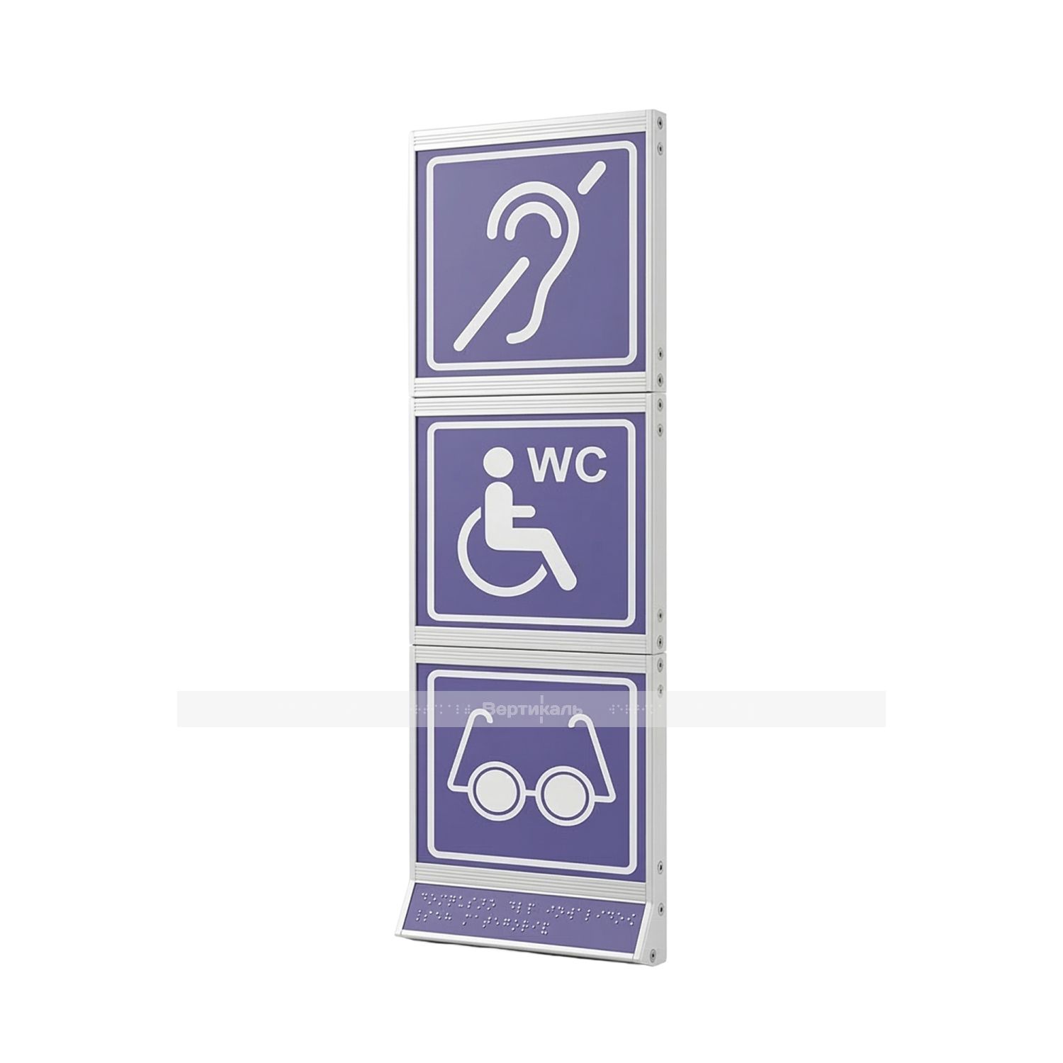 Пиктограмма тактильная, модульная "Доступность объектов для инвалидов по зрению и по слуху, а также в креслах-колясках", с наклонным синем полем, трехсекционная