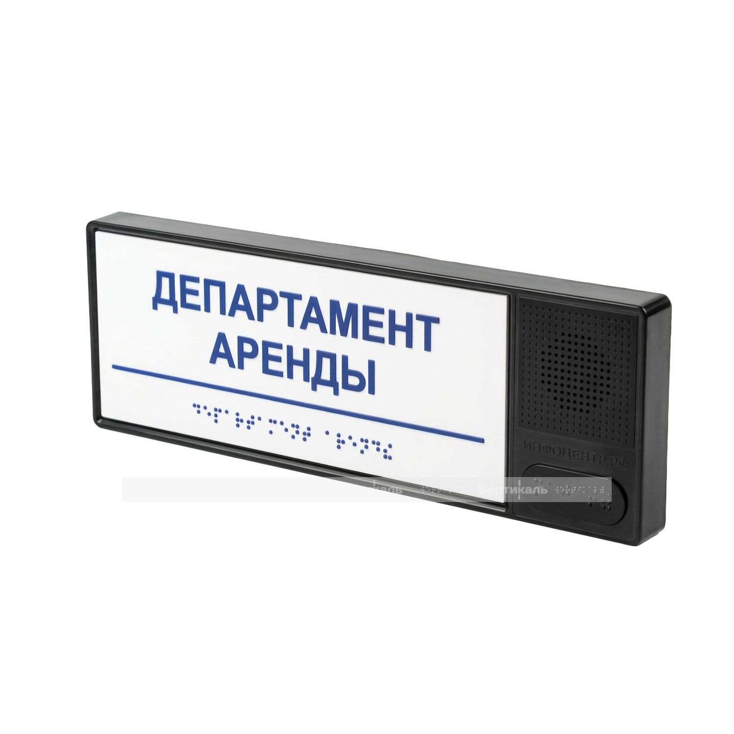 Табличка оснащена кнопкой, при помощи которой воспроизводится любое сообщение для посетителей. Длительность записи составляет до 90 секунд. Кнопка активации голосового сообщения так же выполнена методом литья, шрифт Брайля имеет единую структуру с основанием, что также гарантирует долговечность использования устройства.
