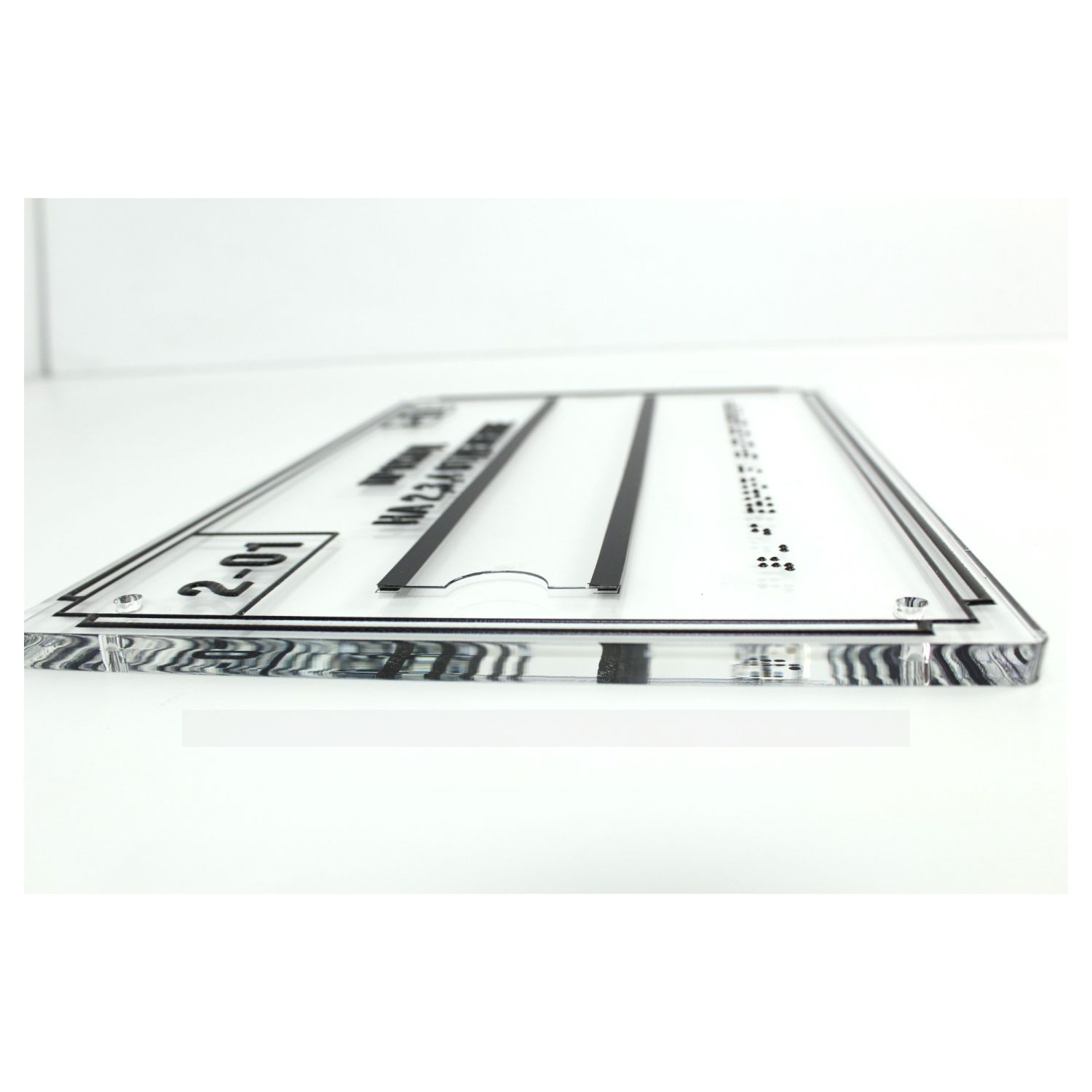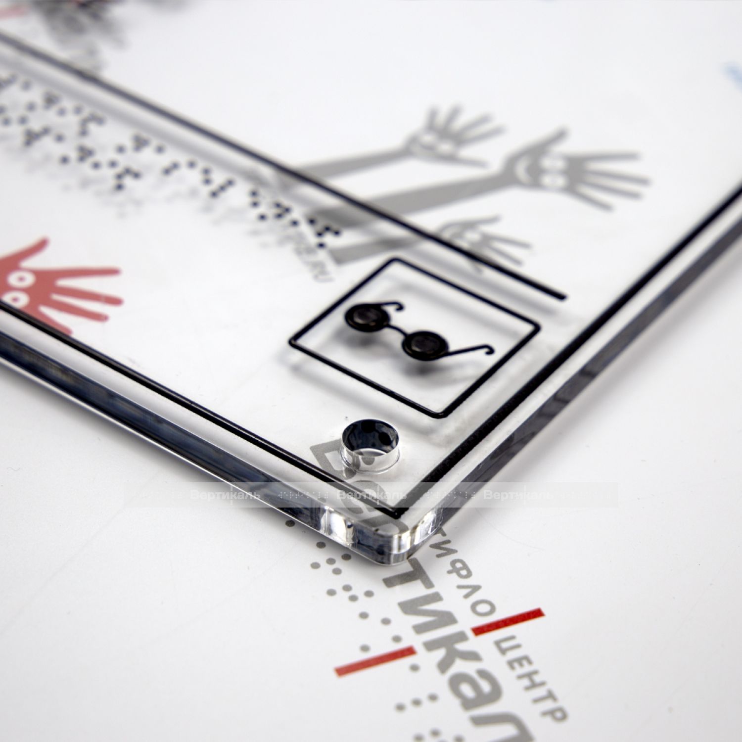 Прозрачные поверхности с тактильным эффектом, представляют собой информационный указатель, который, в зависимости от толщины материала, можно изготавливать с оригинальным дизайном. В качестве материала используются оргстекло 3мм, обладающее не только высокой прочностью, но и эластичностью, что позволяет использовать их даже на полукруглых поверхностях.