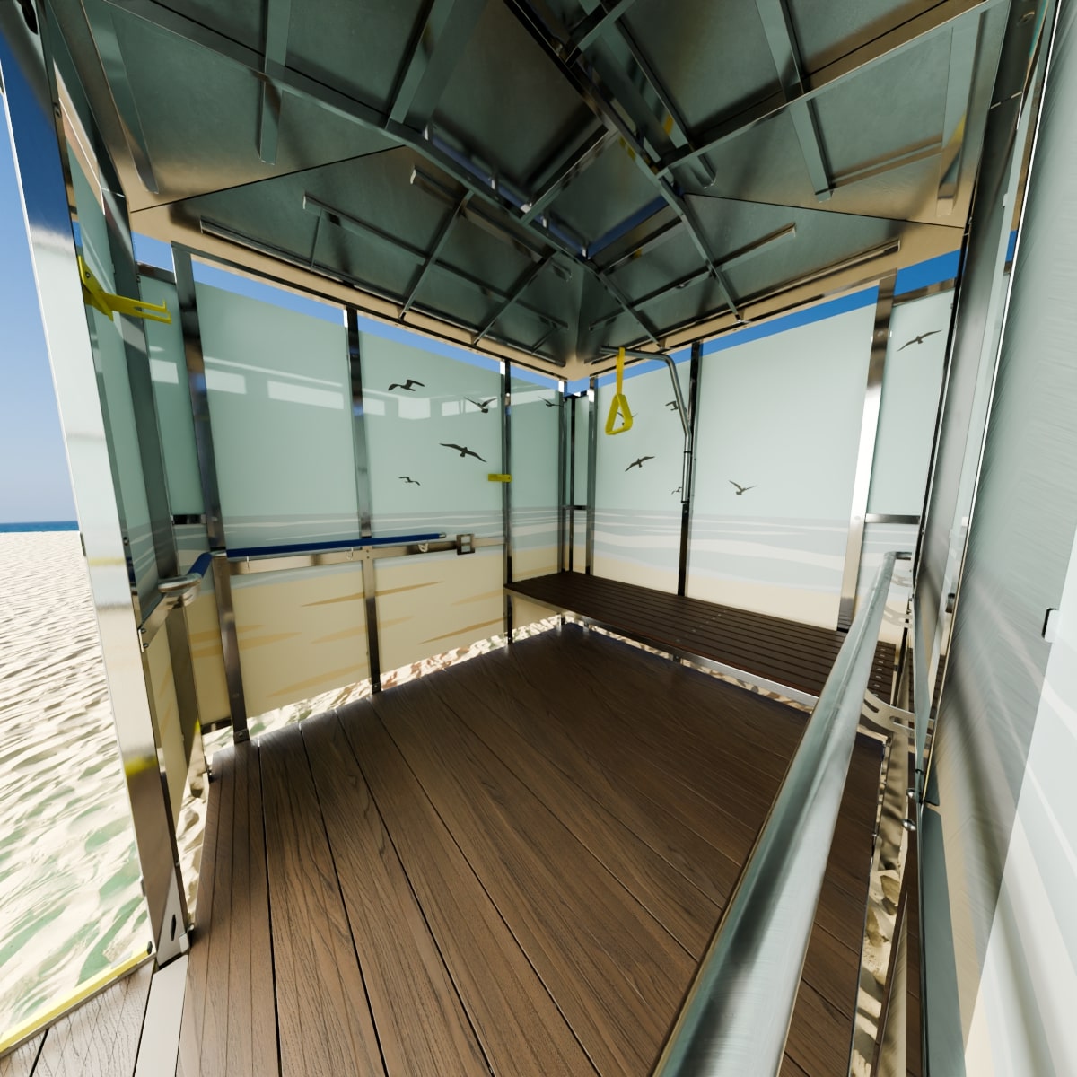 При создании кабинки мы уделили первостепенное внимание долговечности и стойкости к агрессивным внешним факторам. Конструкция рассчитана на интенсивную ежедневную эксплуатацию в прибрежной зоне с повышенной влажностью и соленым воздухом. Прочный несущий каркас выполнен из профильной трубы Ст3, а стены облицованы алюминиевыми композитными панелями (АКП) с нанесением полноцветного УФ-стойкого изображения. Это не только обеспечивает надежную защиту, но и позволяет интегрировать объект в любой ландшафтный дизайн. Крыша из прозрачного 8-миллиметрового оргстекла создает естественное освещение в течение дня и надежно защищает от осадков.