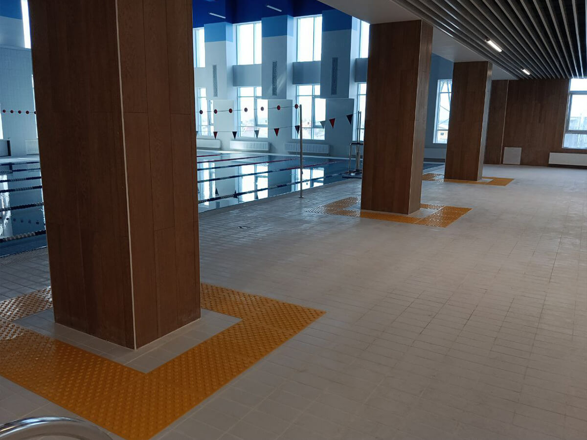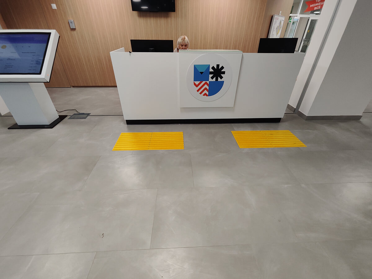 - Тактильные указатели и напольные направляющие, которые помогают слабовидящим детям самостоятельно строить маршруты.