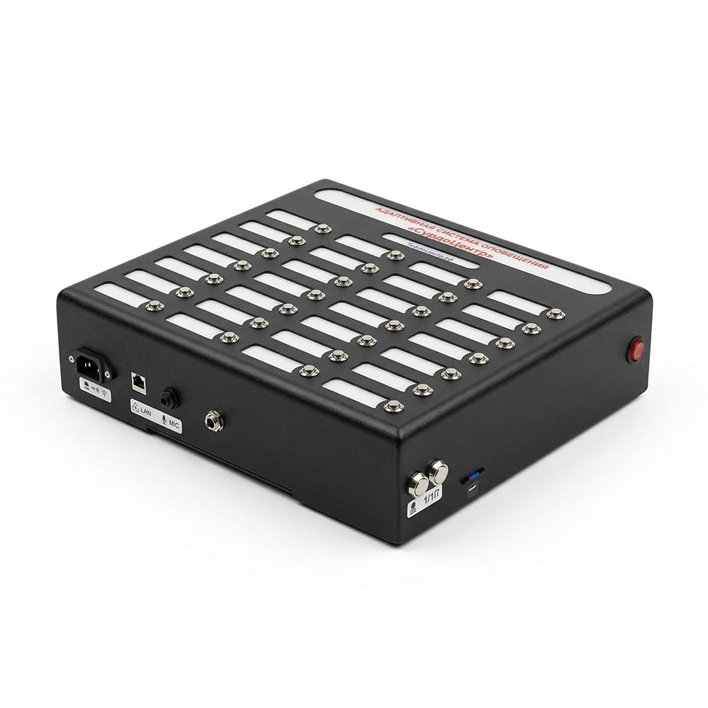 - Режим прямого речевого вещания: на боковой грани предусмотрен интерфейс для внешнего микрофона. Это дает возможность диспетчеру или руководителю транслировать голосовые инструкции в реальном времени на все табло и громкоговорители сети.