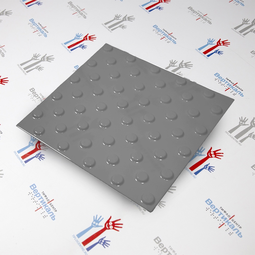 Тактильная плитка из нержавеющей стали Изготавливается из стали AISI 304 толщиной 1–2 мм. Имеет группу горючести НГ (негорючие материалы), поэтому применяется в местах с повышенными требованиями пожарной безопасности. Для амортизации используется пластиковый демпфер.